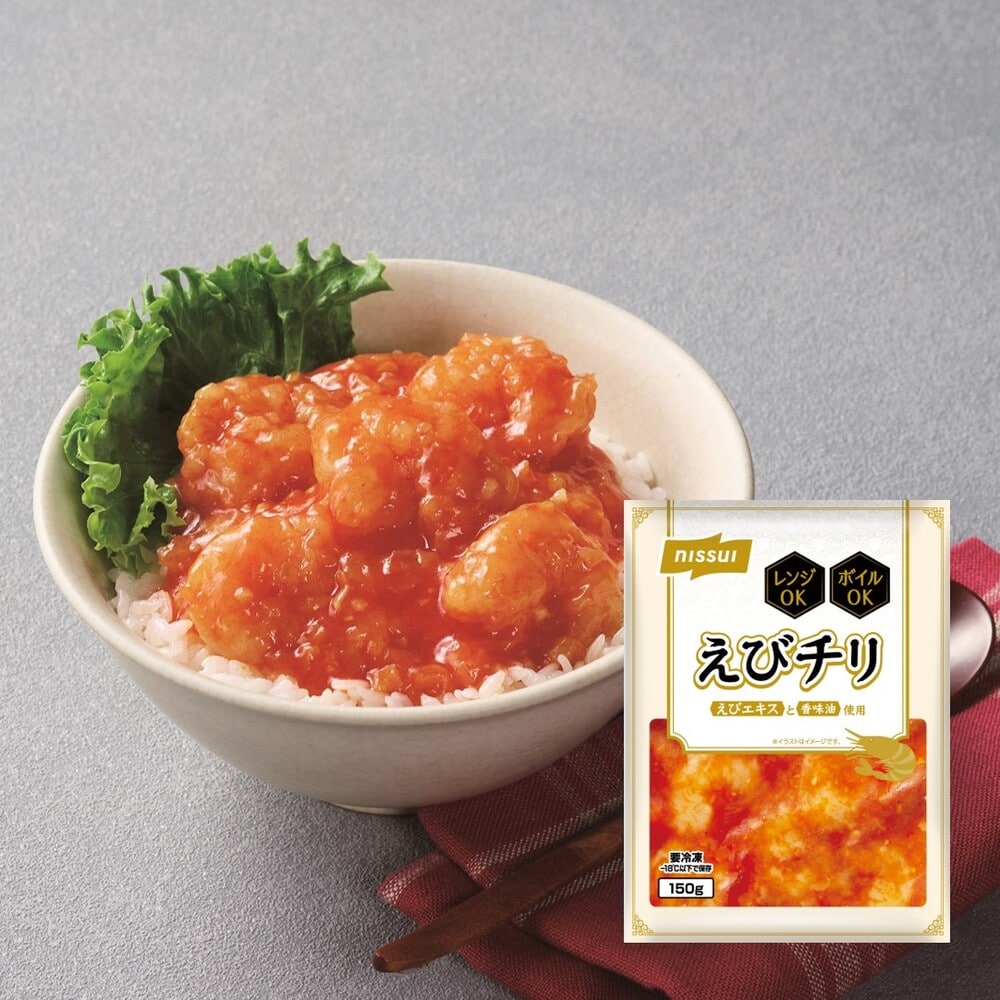 ・えびチリ:ボイルでも電子レンジでも調理が可能な、とても便利な個食タイプのえびチリです。
