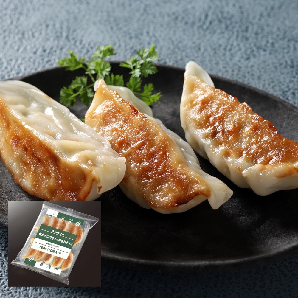 ・焼かずにできる!焼き餃子:電子レンジ調理に対応した焼き目付きの餃子です。時間が経ってもやわらかい皮に仕上げました。国産キャベツの食感と、三元豚の旨みが食欲をそそります。