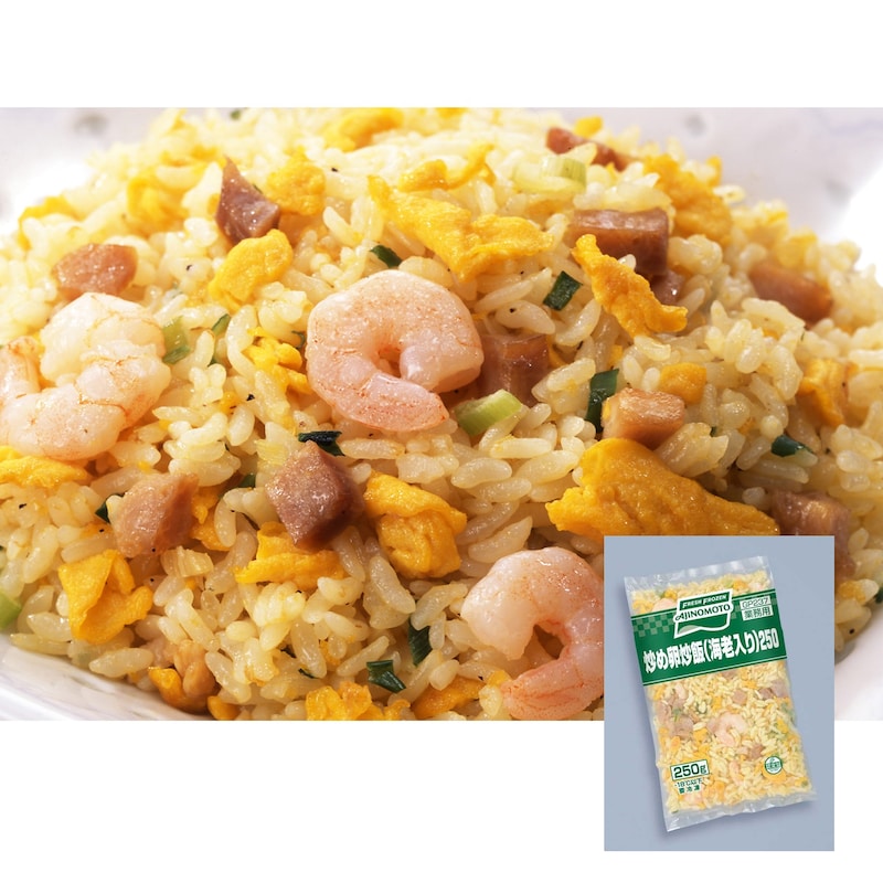 ・海老入り炒飯:強火で炒めた焼き卵が香る、中華飯店系の上品な味つけの炒飯です。お米を強火でしっかり炒めているので、炒飯独自の風味、食感がお楽しみいただけます。