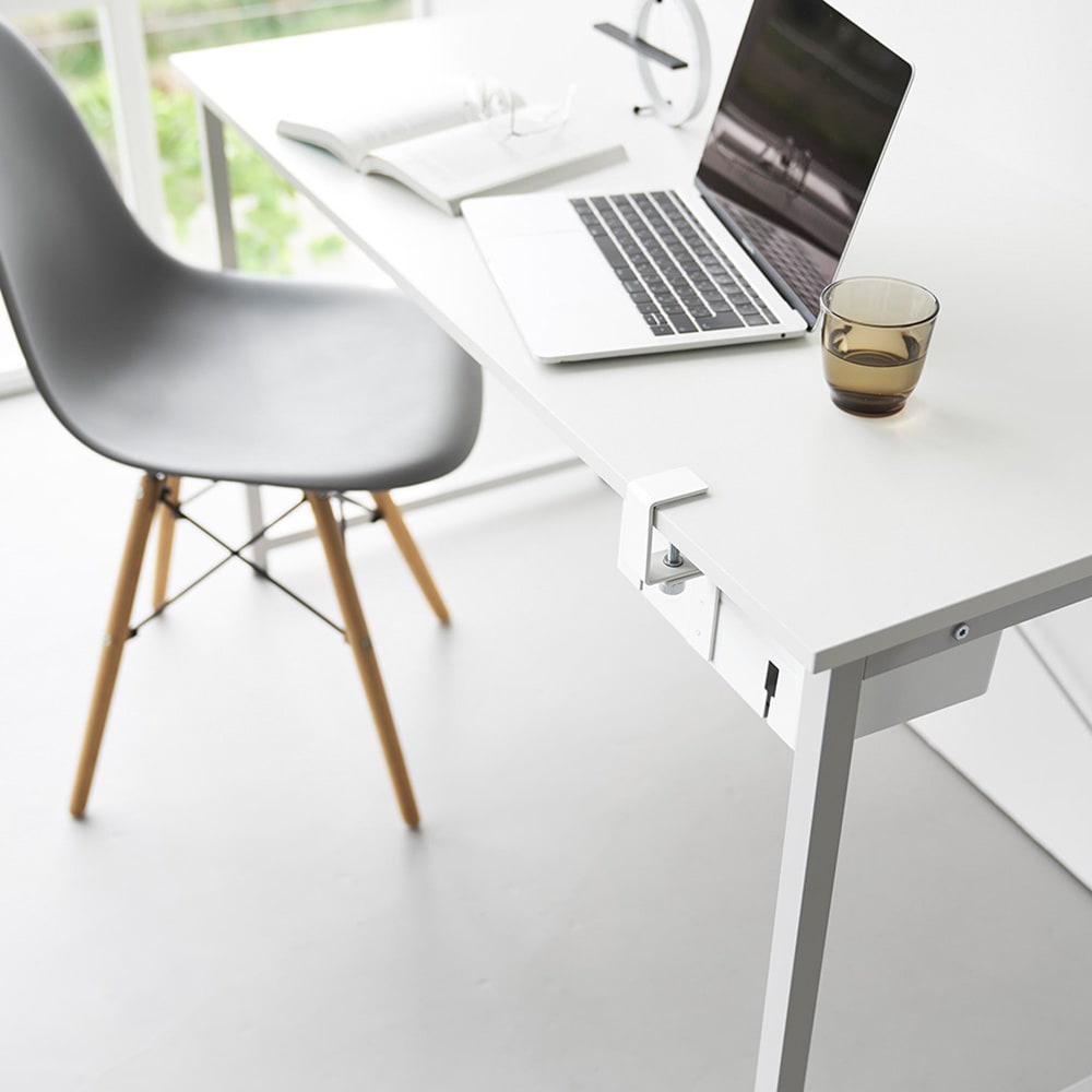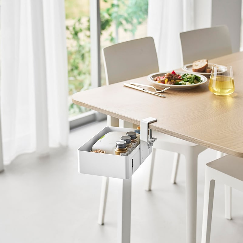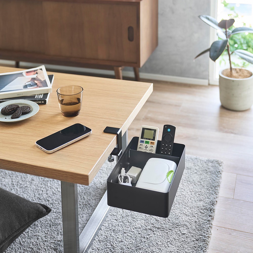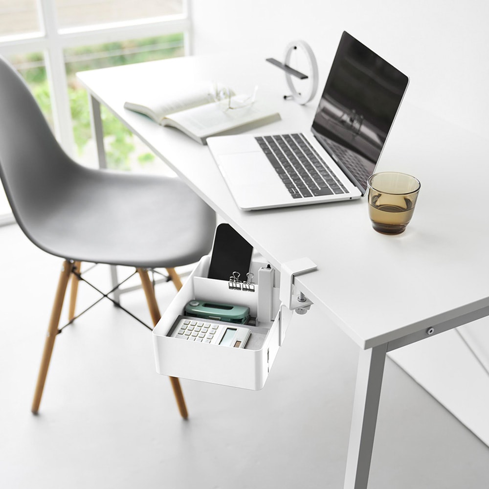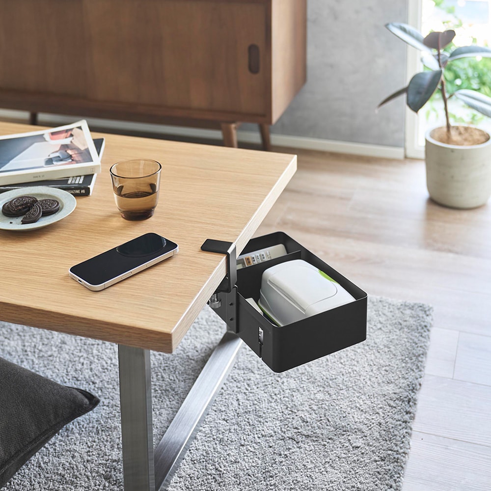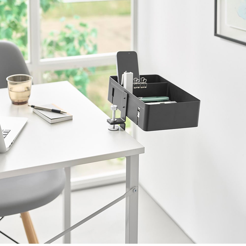 パソコン台のテーブルサイドに設置してみました。いろんな向きに取り付け可能なので、便利なアイテムだと思いました。しっかりと取り付けられて、仕切り付きでスッキリ収納できて使いやすいです。