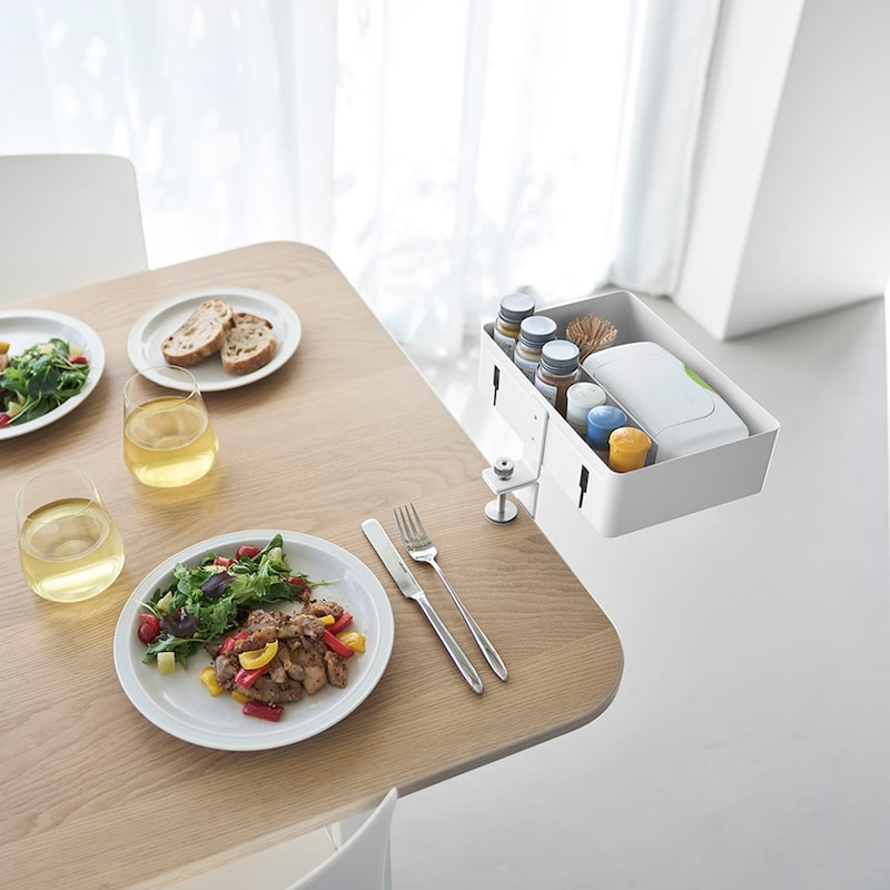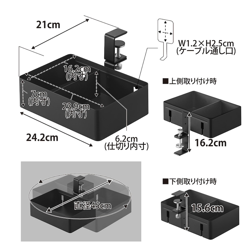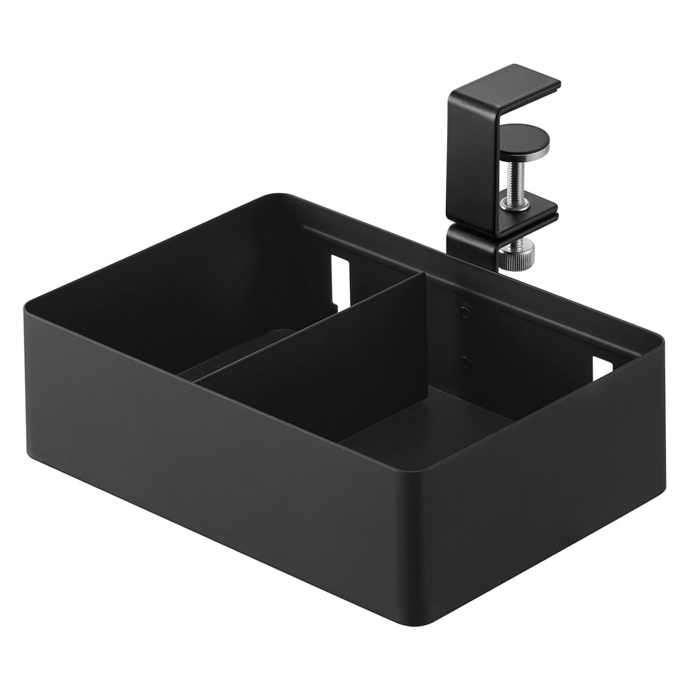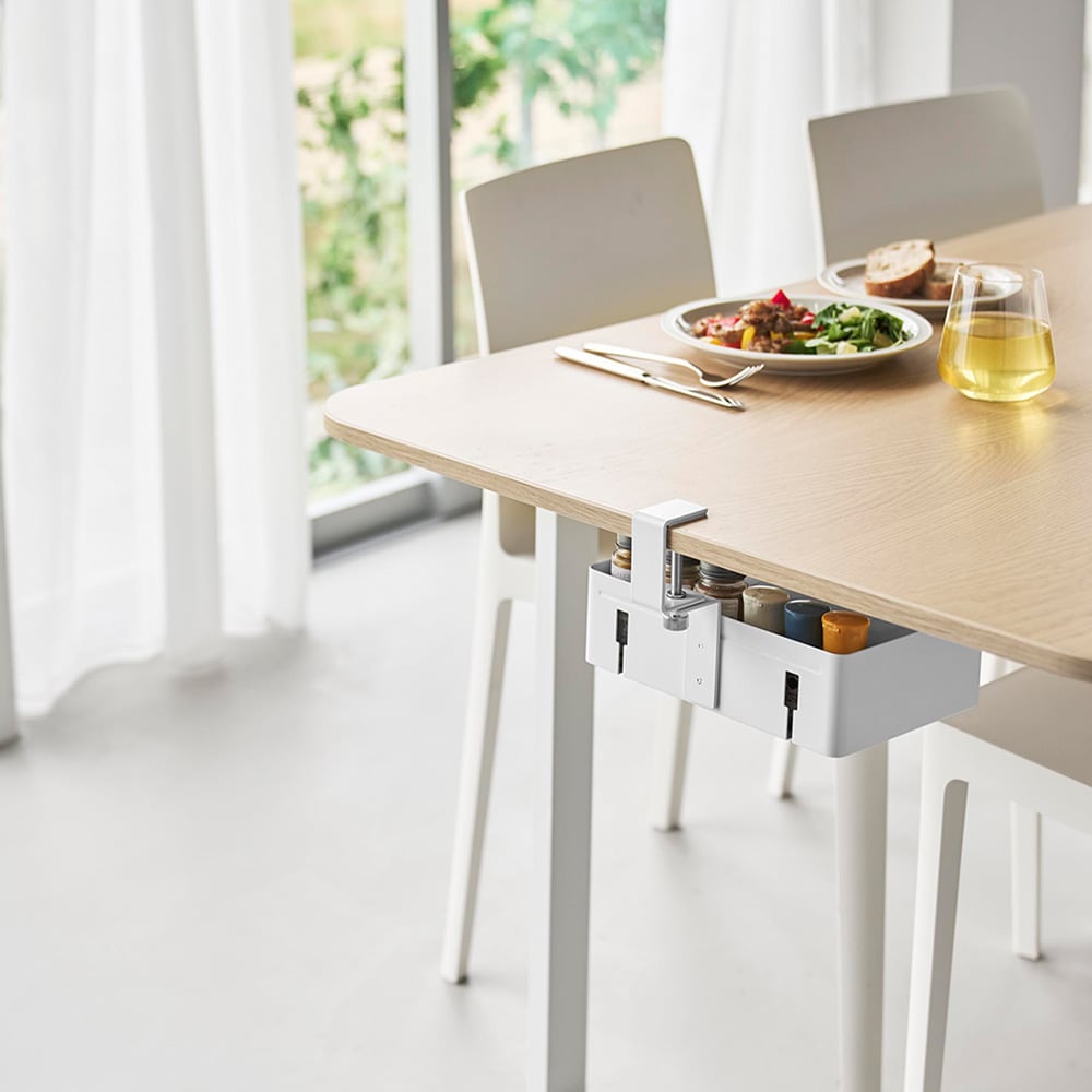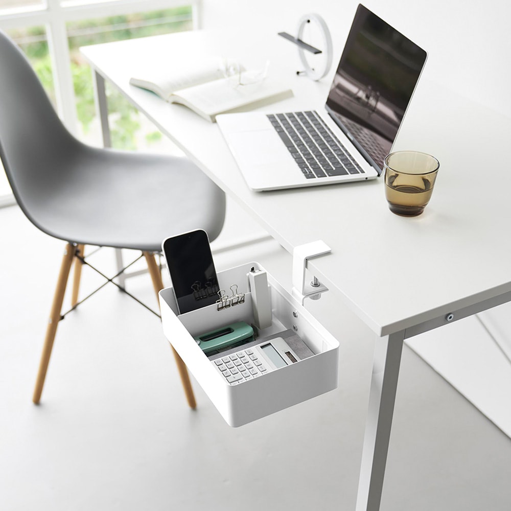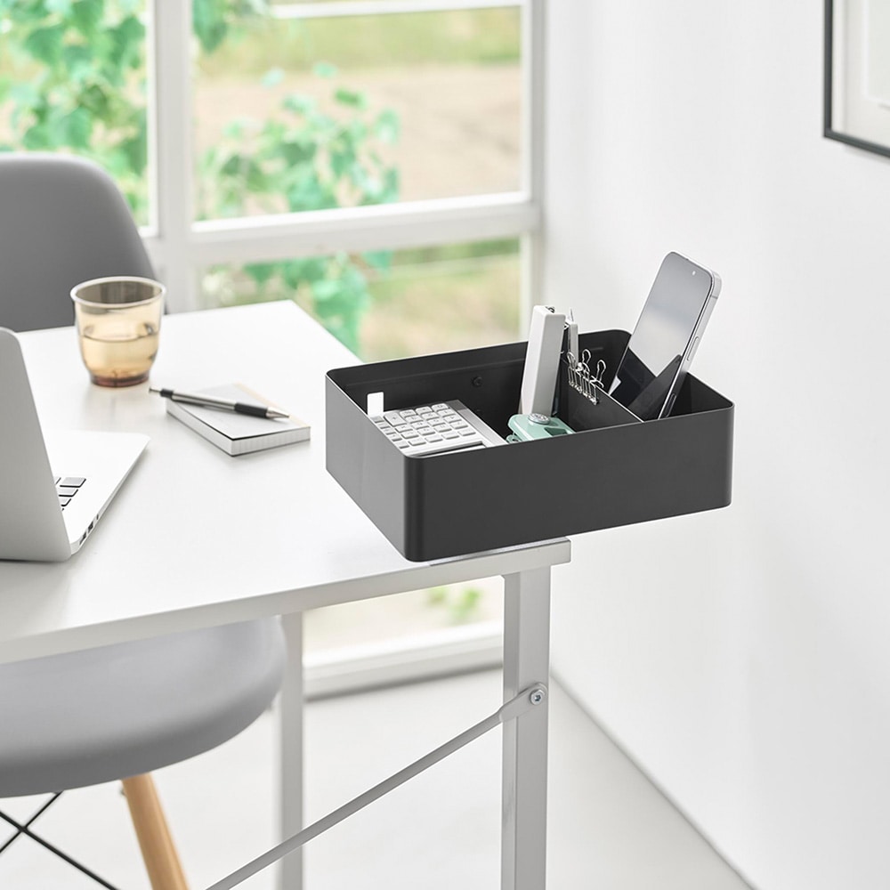 パソコン台のテーブルサイドに設置してみました。いろんな向きに取り付け可能なので、便利なアイテムだと思いました。しっかりと取り付けられて、仕切り付きでスッキリ収納できて使いやすいです。