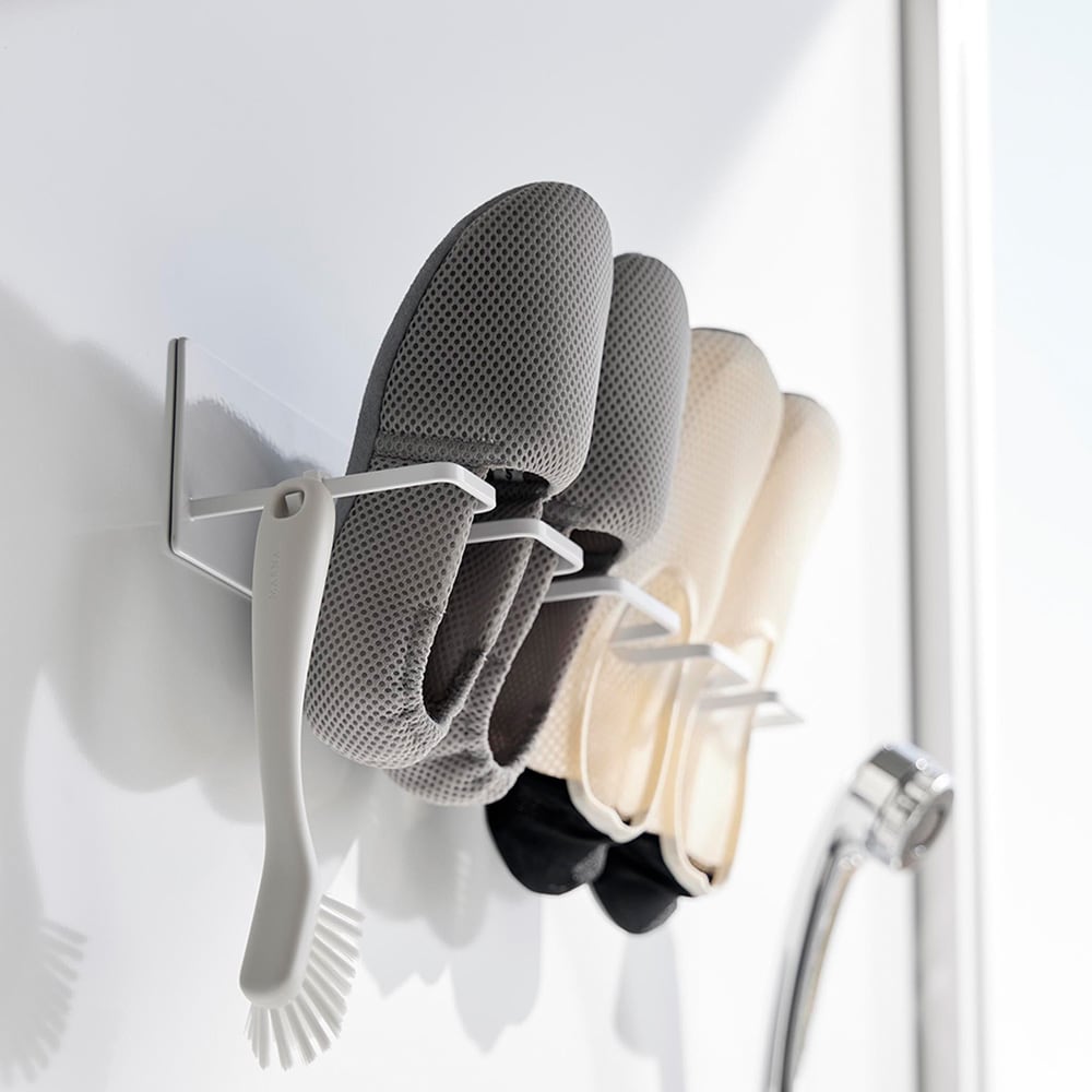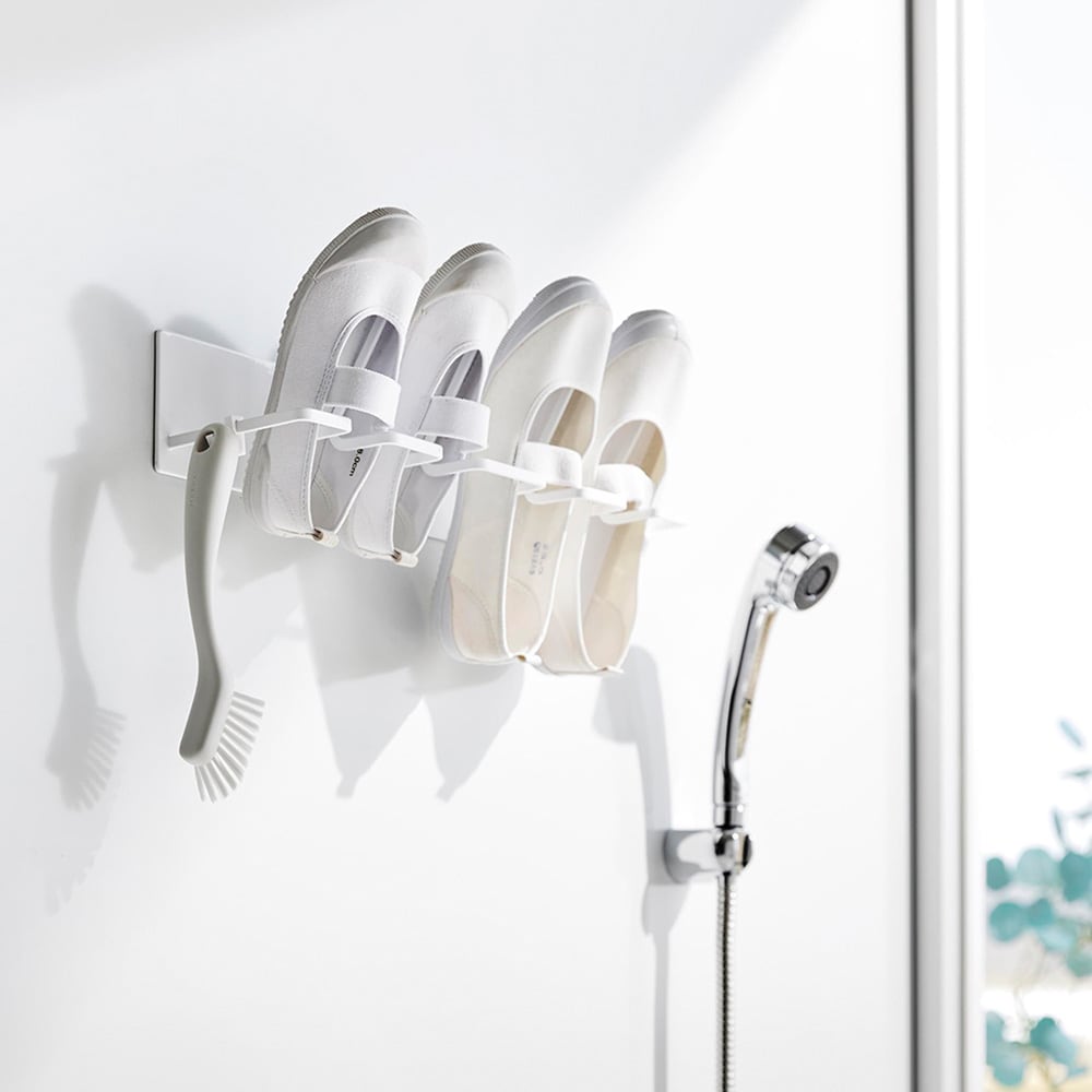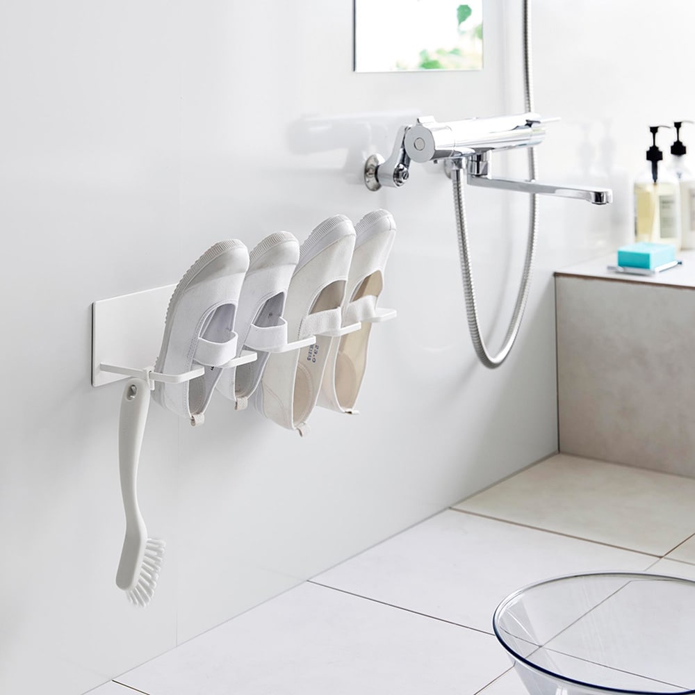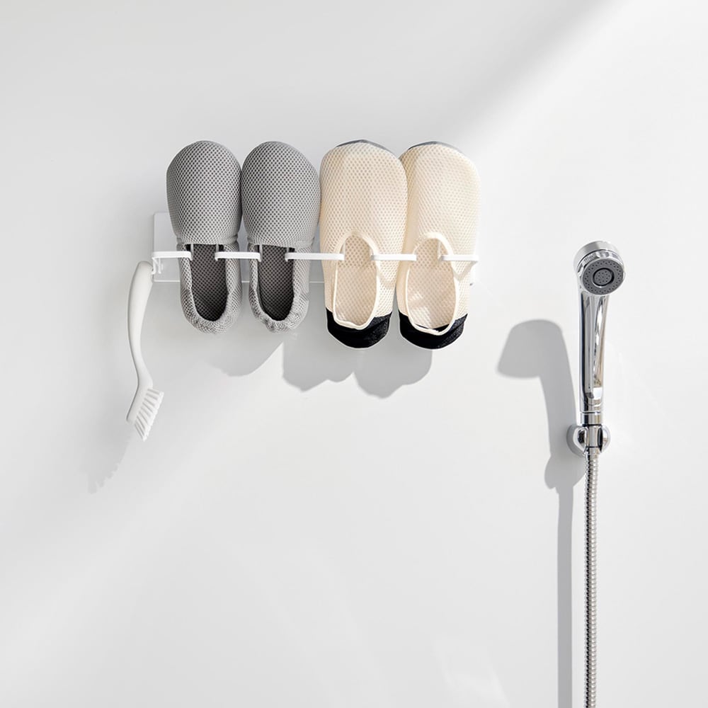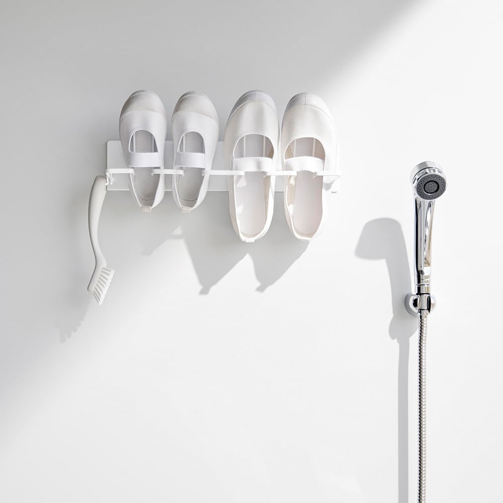 お風呂場で子どもの上靴やスニーカーを洗ってすぐ干せるのも、干した際に、斜めになるよう設計されているので、かかとに水がたまらず水切れが良いので乾きやすいこともすごく良くて、重宝しています。