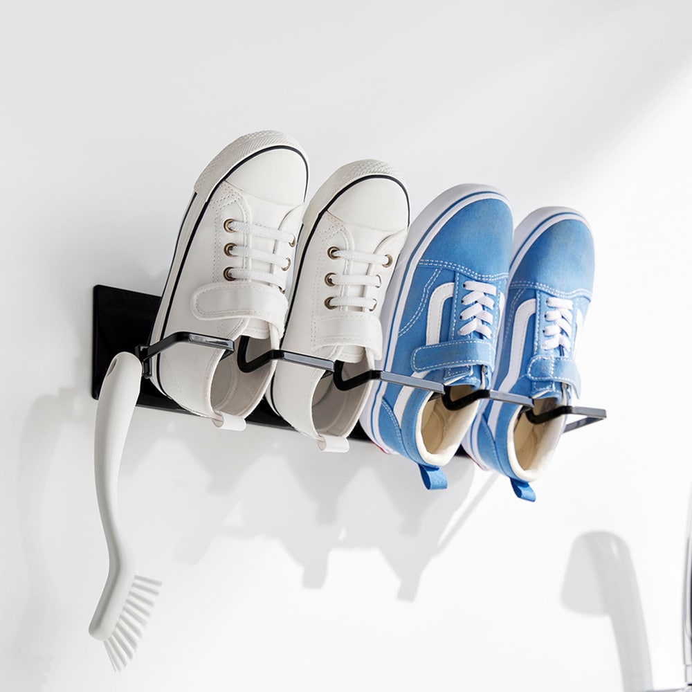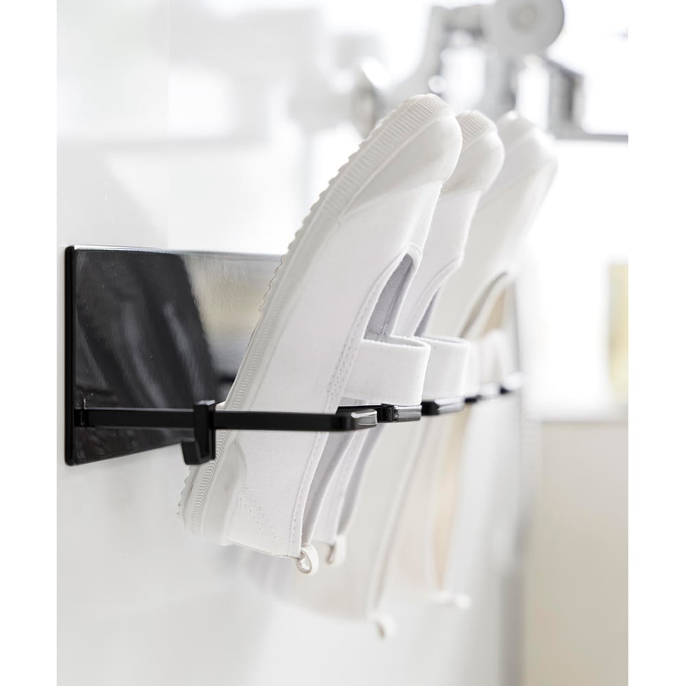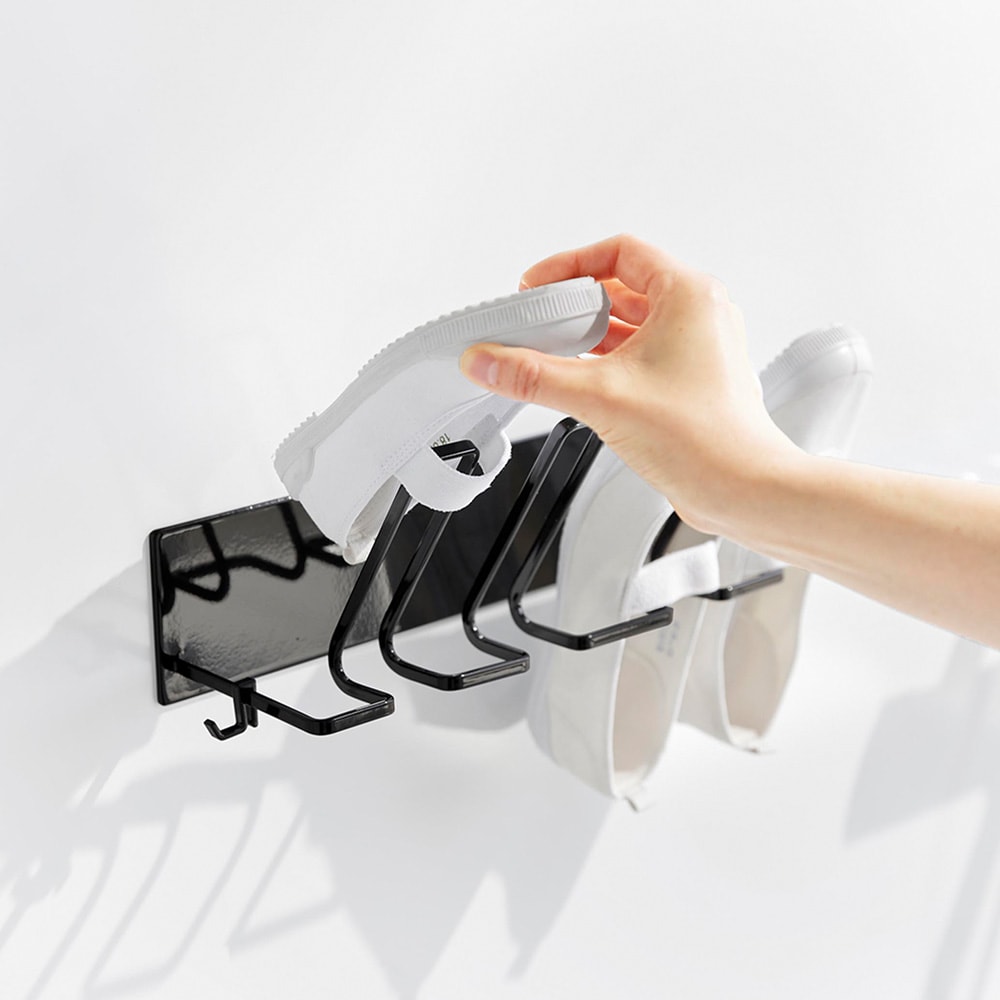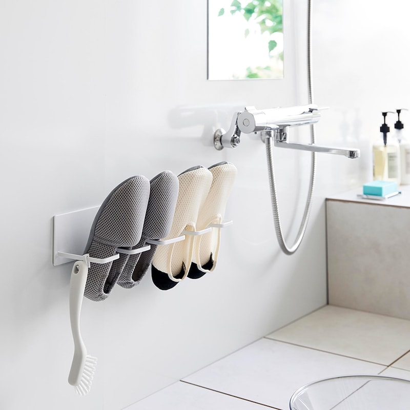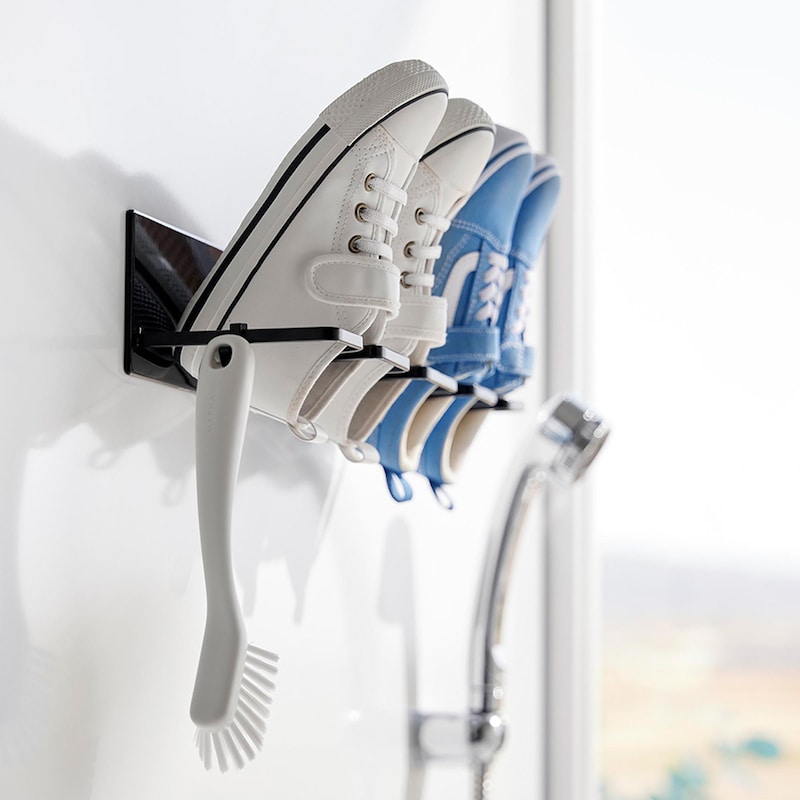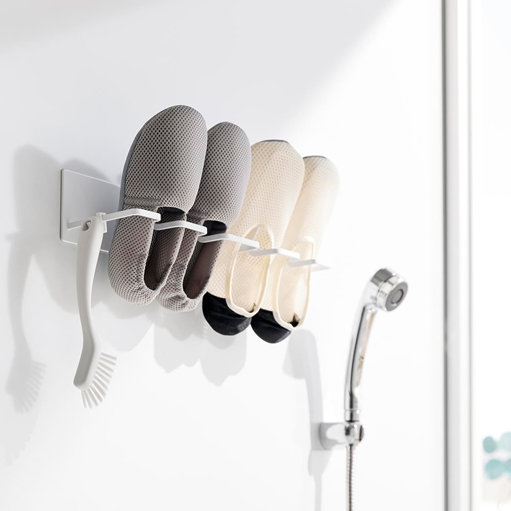 お風呂場で子どもの上靴やスニーカーを洗ってすぐ干せるのも、干した際に、斜めになるよう設計されているので、かかとに水がたまらず水切れが良いので乾きやすいこともすごく良くて、重宝しています。