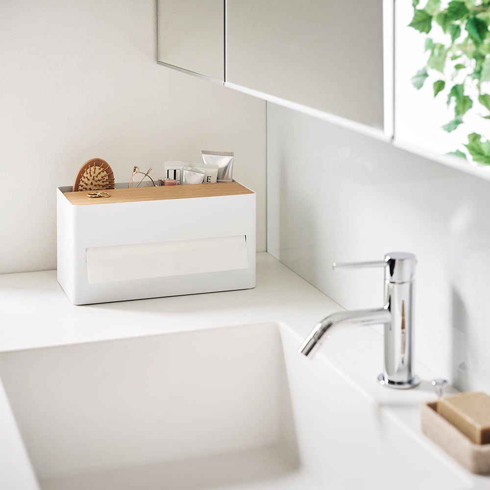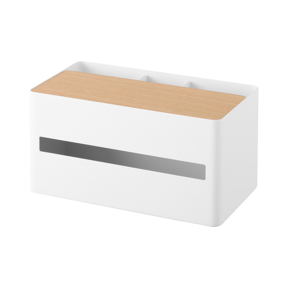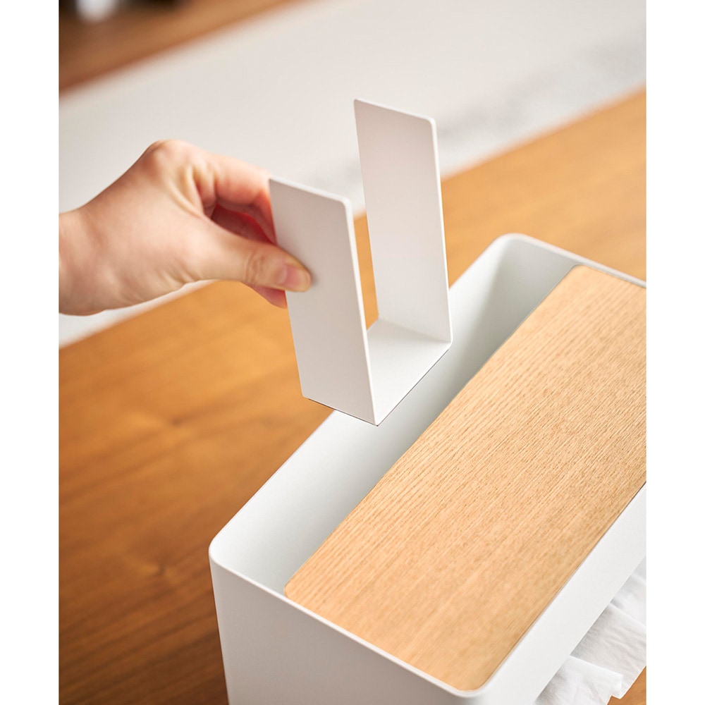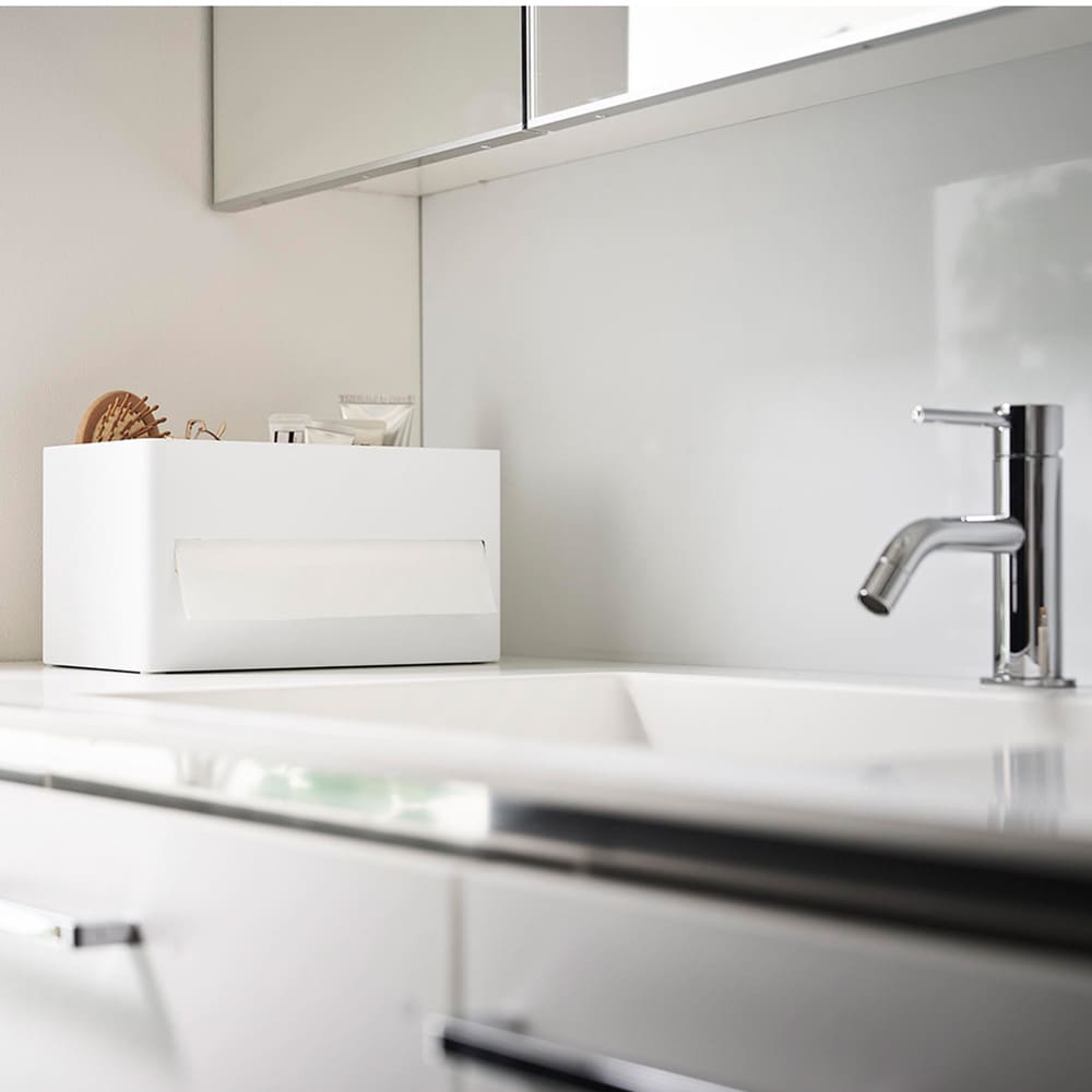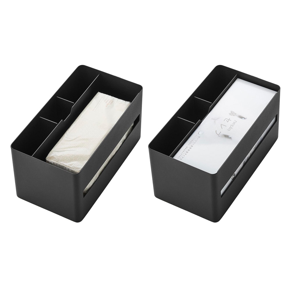 厚型のティッシュボックスやソフトパックティッシュ、ペーパータオルにも対応した収納ケースです。
