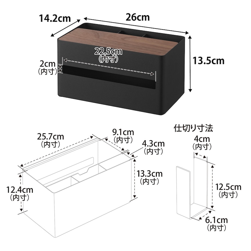 ●内寸/ペーパー収納部:幅約25.7、奥行約9.1、高さ約12.4cm、ペーパー取り出し口:幅約22.5、高さ約2cm、リモコン収納部(開口部):幅約25.7、奥行約4.3、高さ約13.3cm、仕切り:幅約6.1、奥行約4、高さ約12.5cm