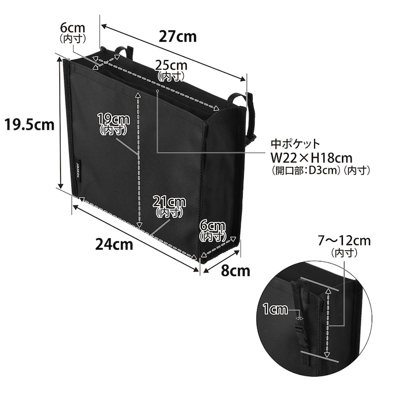●内寸サイズ/収納部:幅約25、奥行約6、高さ約19cm、中ポケット:幅約22、高さ約18cm(開口部:奥行約3cm)、ループ部の長さ:7~12cm