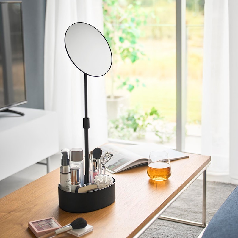 高さと角度が調節できる収納付きスタンドミラー