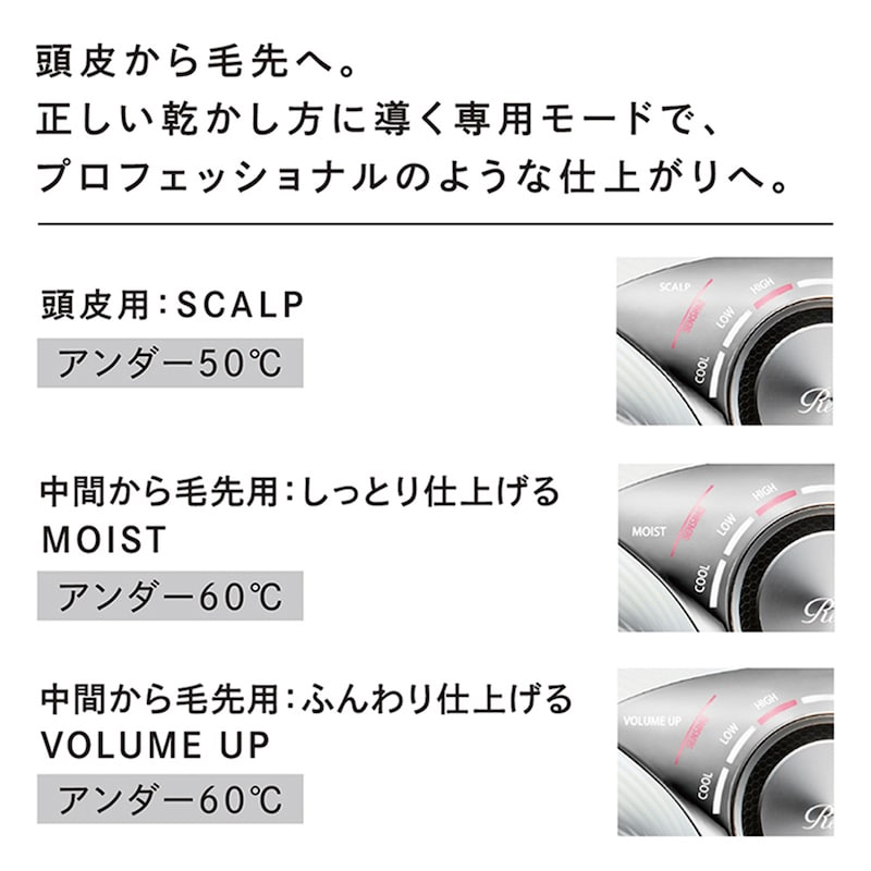 プロセンシングは、熱を手先で感知し、ドライヤーを振ったり温風と冷風を切り替えたりすることで、最適な温度をつくり出すプロの技を再現したテクノロジー。対象物センサーが頭皮と毛先の温度を感知し、温風と冷風を自動で切り替えることで、頭皮は約50℃以下、毛先は約60℃以下をキープ。頭皮と毛先を熱ダメージから守ります。