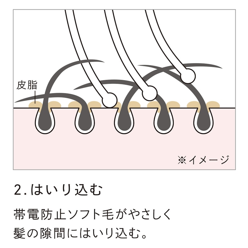 帯電防止ソフト毛がやさしく髪の隙間にはいり込む。