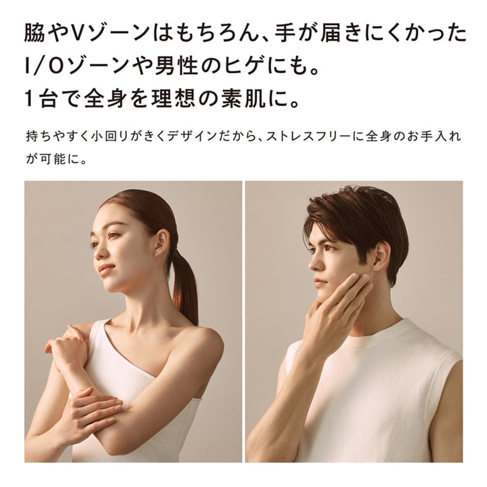 ●脇やVゾーンはもちろん、手が届きにくかったI/Oゾーンや男性のヒゲにも。1台で全身を理想の素肌に。