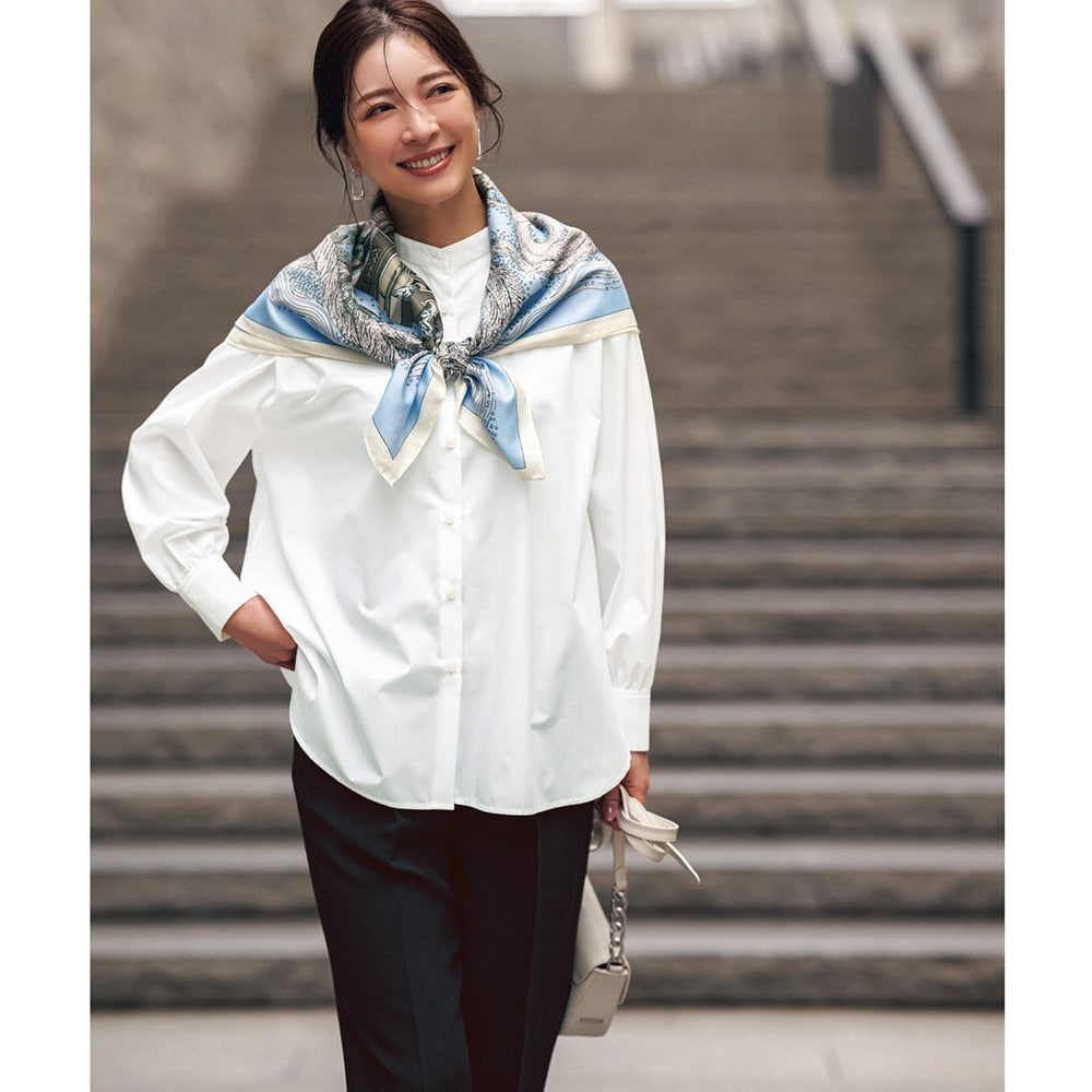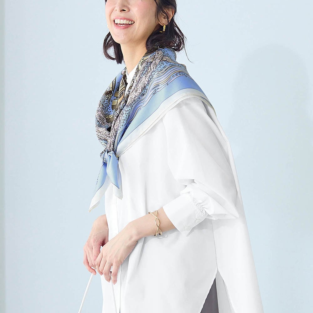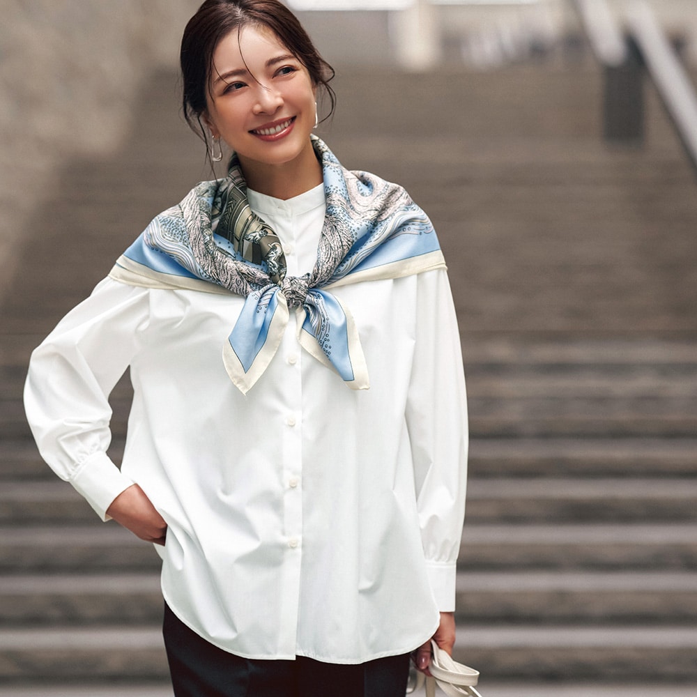 • スカーフは光沢感のある素材で顔まわりを明るく