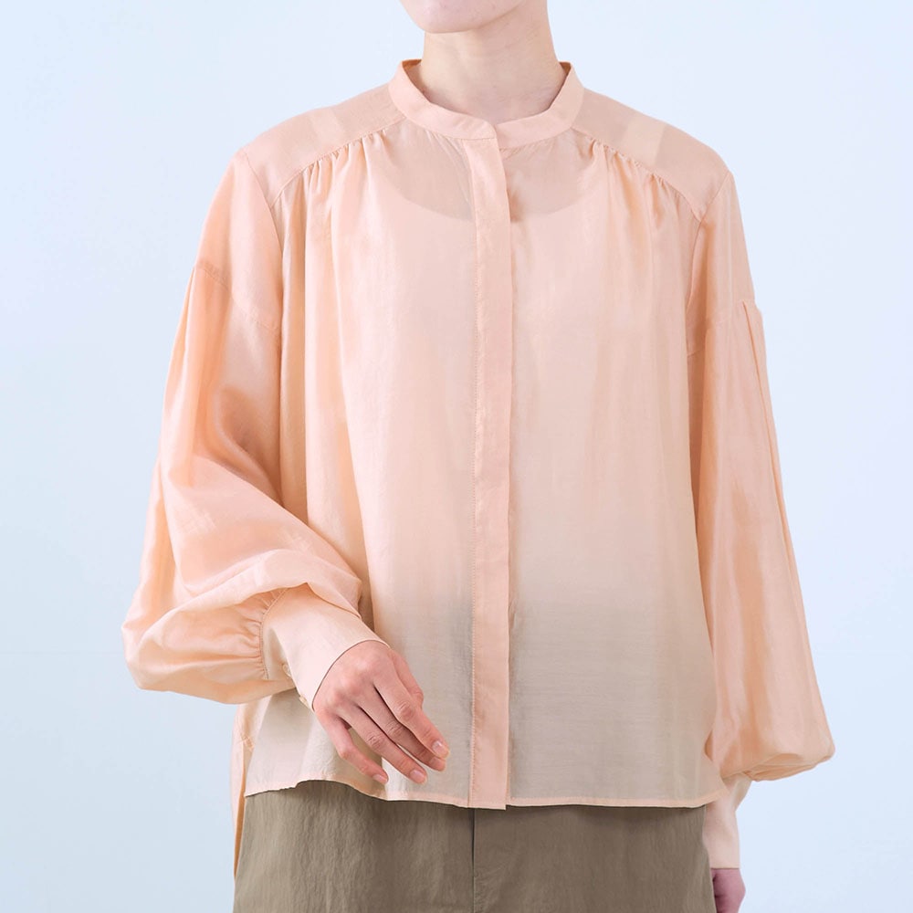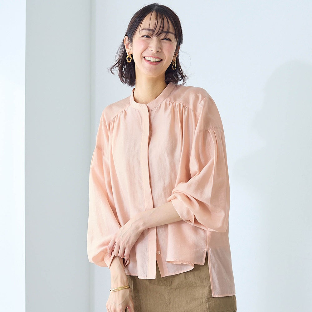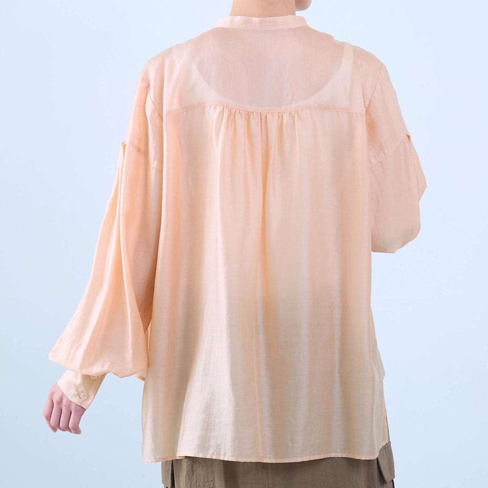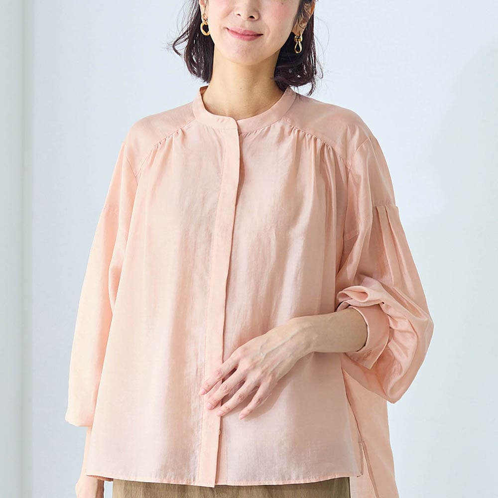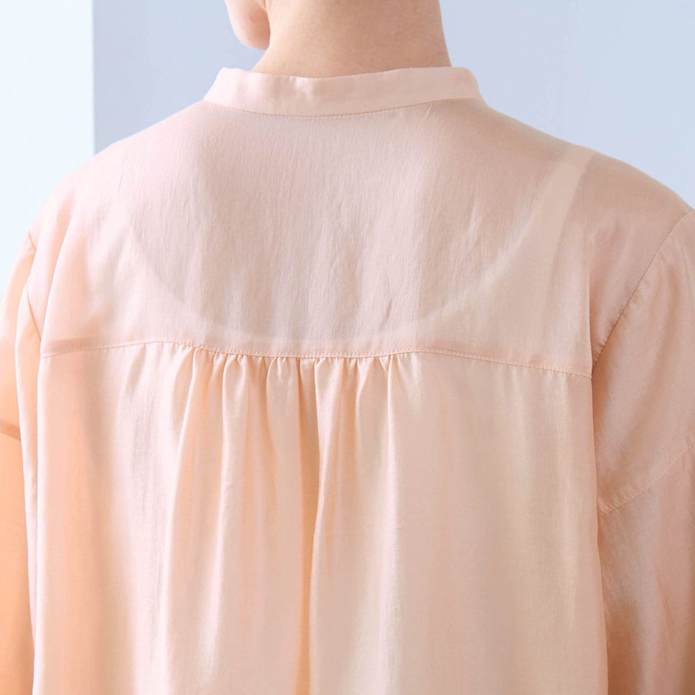 シアーピンクはややオレンジ気味の可愛い色でふんわりした袖もとても気に入りました。ツヤもあり透け感もあるのでインに着る物に気を使いますがこの夏いっぱい着ます。