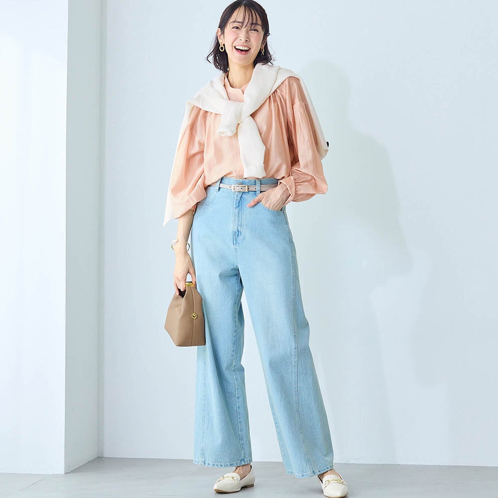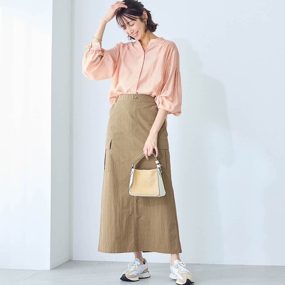 肩に切り替えとさらにそこから少し下がったところにもう一つ切り替えがあり、そこからタックがとってあるのも、私には上半身のボリューム感が出てしまいました。もう少し落ち感のある生地だったら高見えして綺麗だったかなと感じました