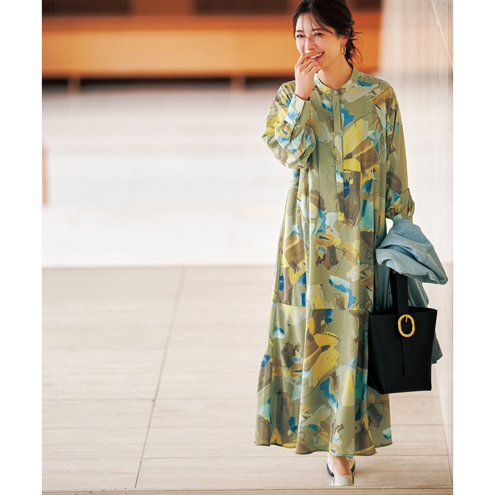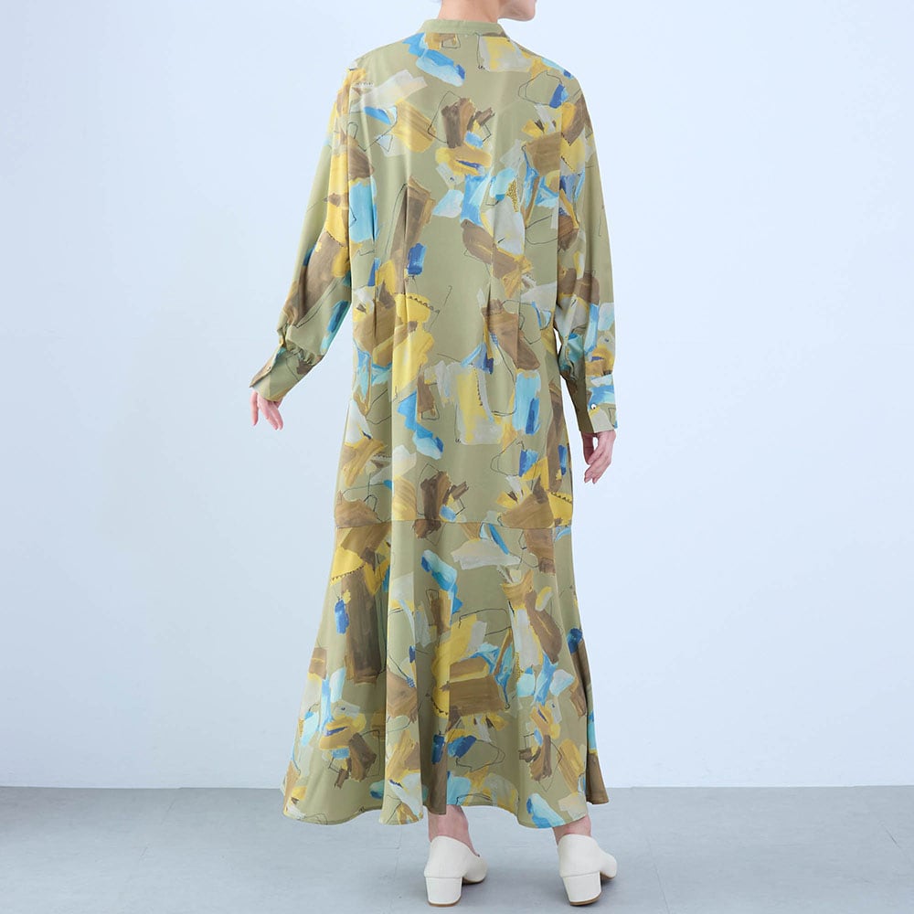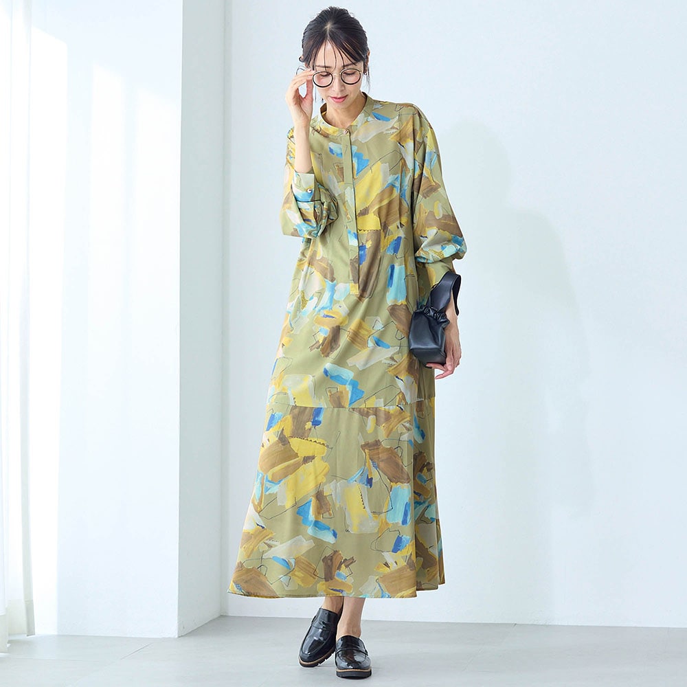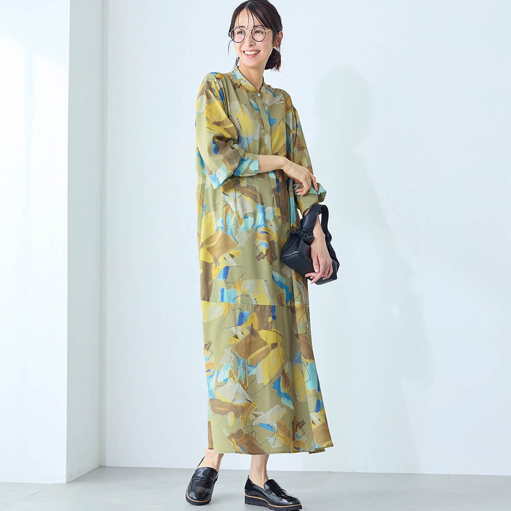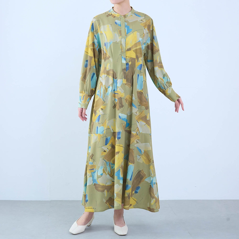 ・やさしげなカラーリングでまとめたペイント柄ワンピース
