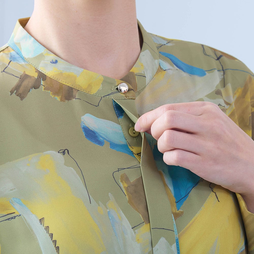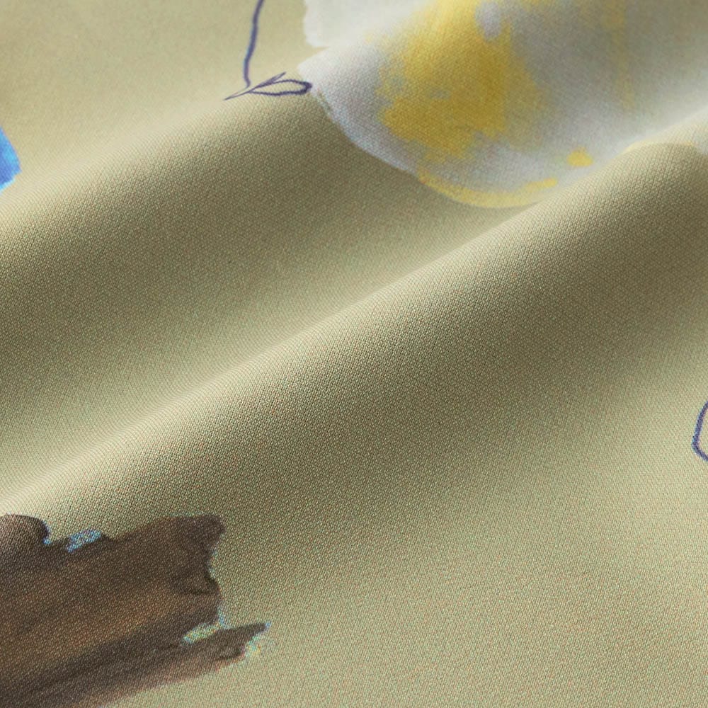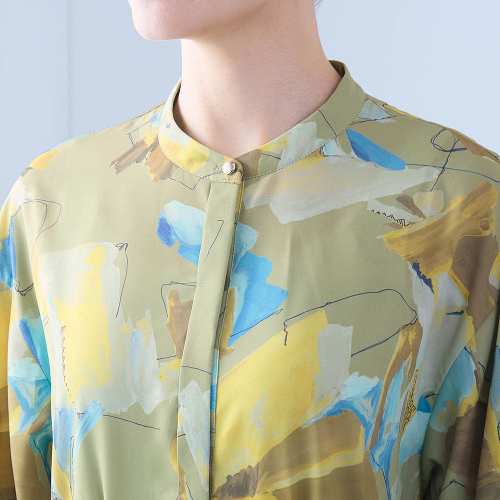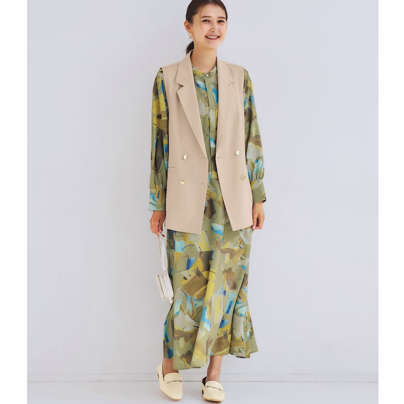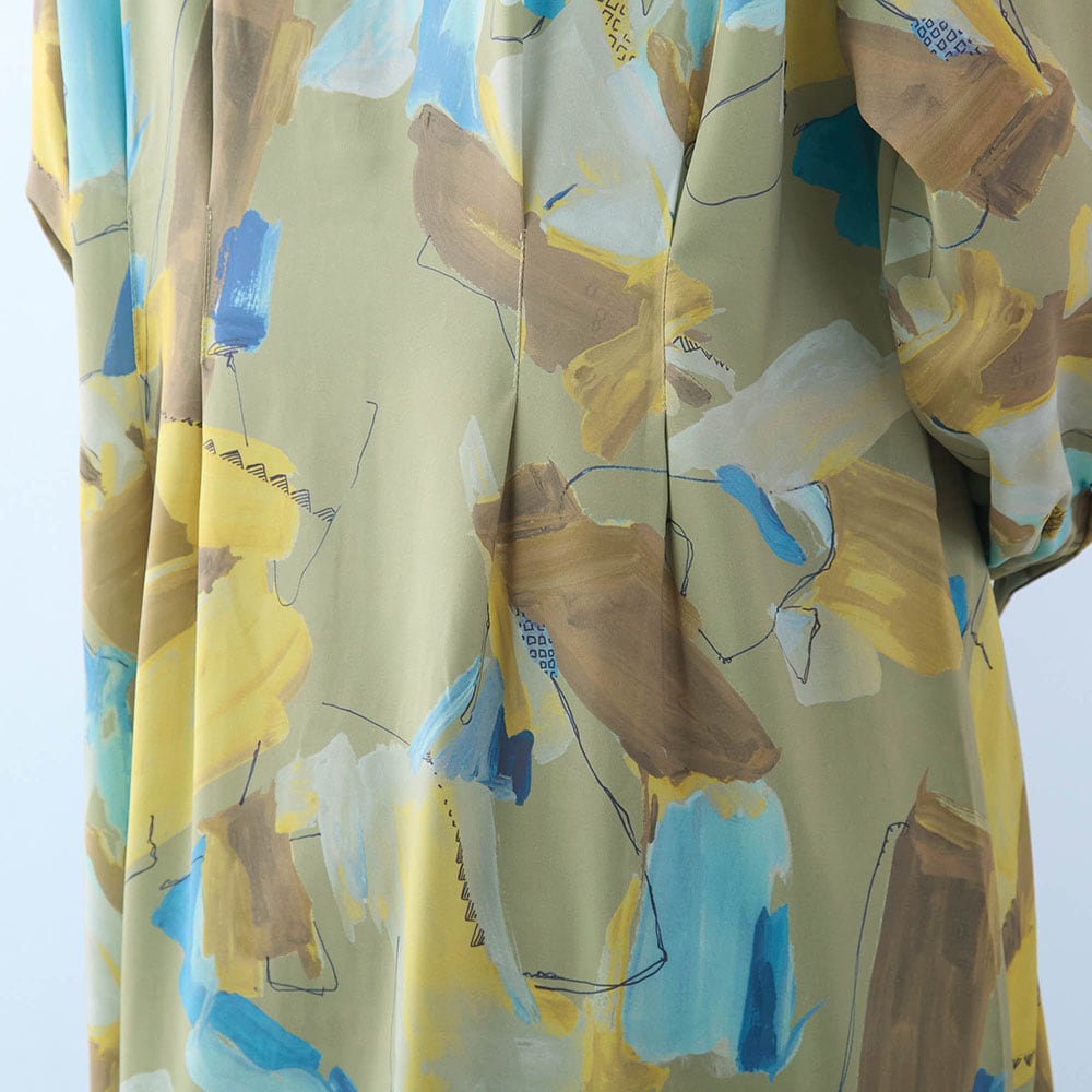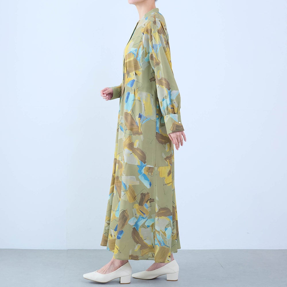 ・やさしげなカラーリングでまとめたペイント柄ワンピース