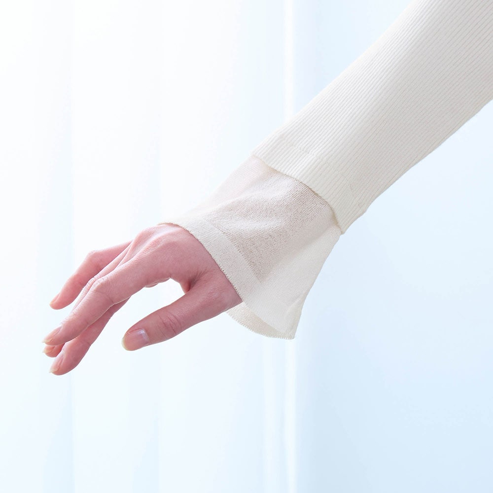 袖のデザインが可愛いと思い購入しましたがやはり袖はとても長く、折角のその部分は折るわけにもいかず、結局とって着ることにしました。後サイズはカタログでは非常にバストなど細いかなと思いましたが、リブなので実際は着て見ると大きかっです。