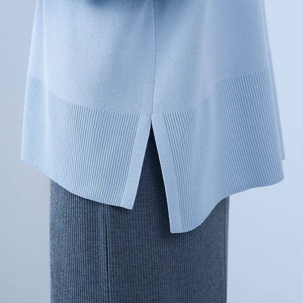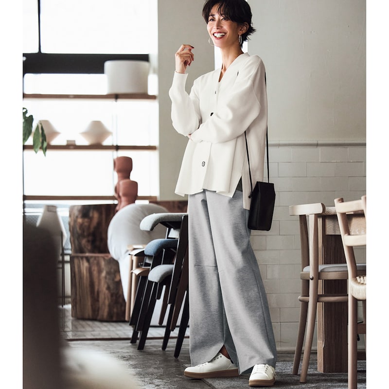 体型カバーとあるのだけに、かなりゆったりしています。袖の幅がとくにゆったりしていると思います。着丈は私には丁度良い感じですが、一つ下のサイズでも良かったかなと思っています。Vネックがこんなに浅いのは珍しいデザインだと思いましたが、着てみるとわりと良い感じです。抑えた感じの白かと思いオフホワイトを選びましたが真っ白でした。