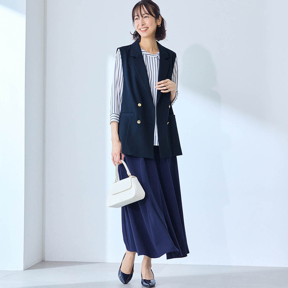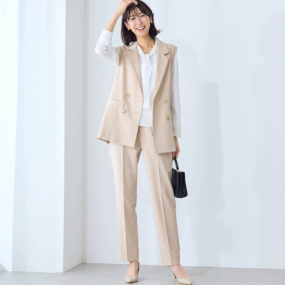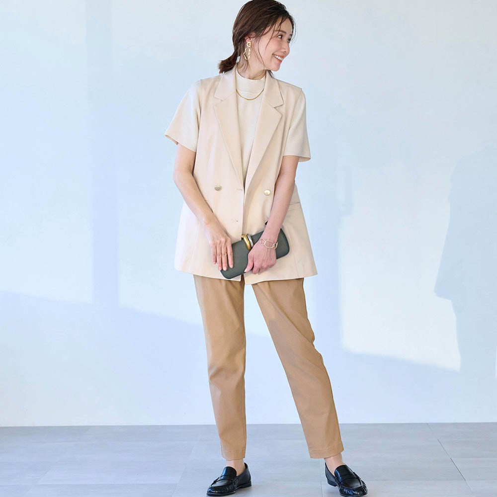 ・きちんとした印象の襟付きジレはオンオフどちらにも対応