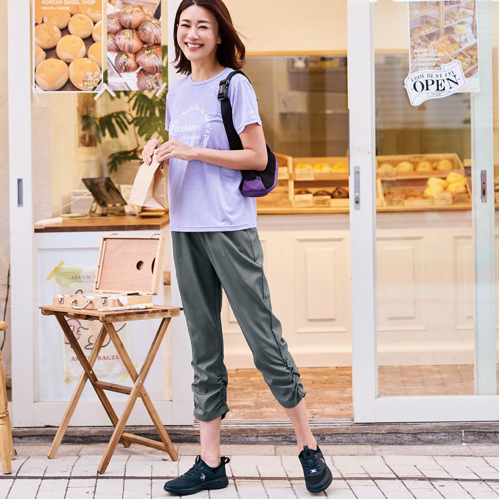 裾にシャーリングを入れ、ワンツーコーデもこなれ見え