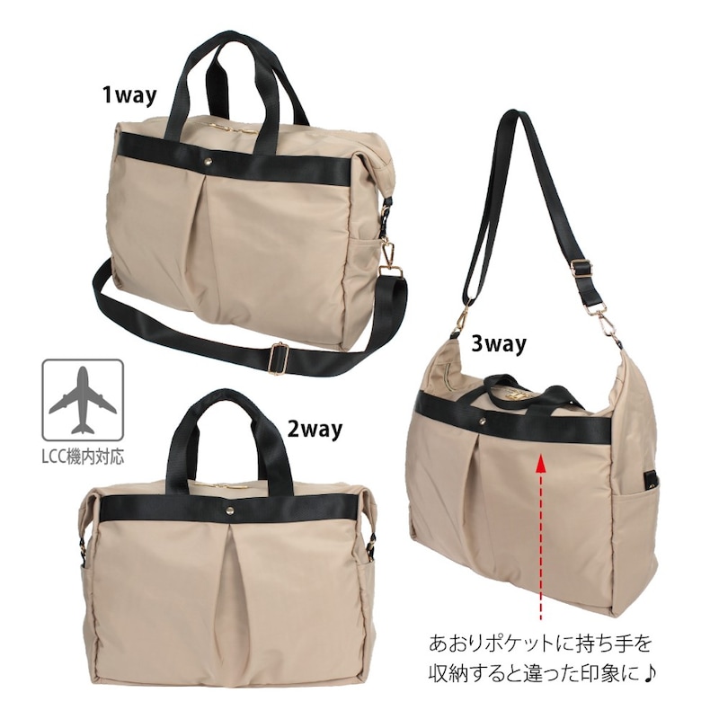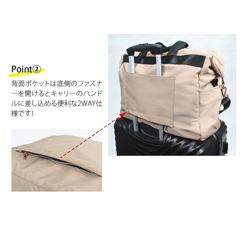 ●ポケット:外 ファスナー×1・マグネットボタン開閉あおりポケット×1・オープン×2・背面2WAYポケット×1(キャリー固定帯にもなる仕様)、中 ファスナーポケット×1・オープンポケット×2