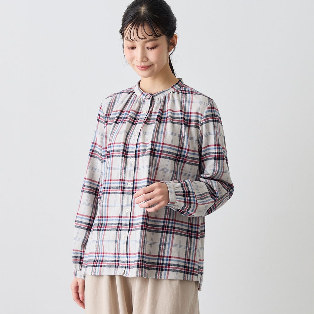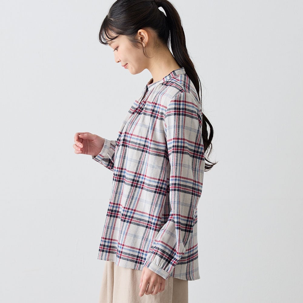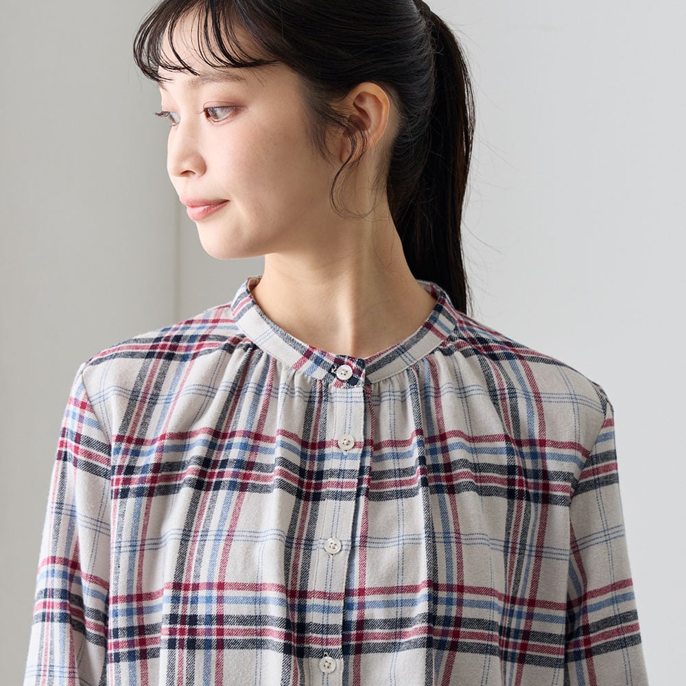 ふんわり感と胸元のギャザーが大人かわいい起毛シャツ