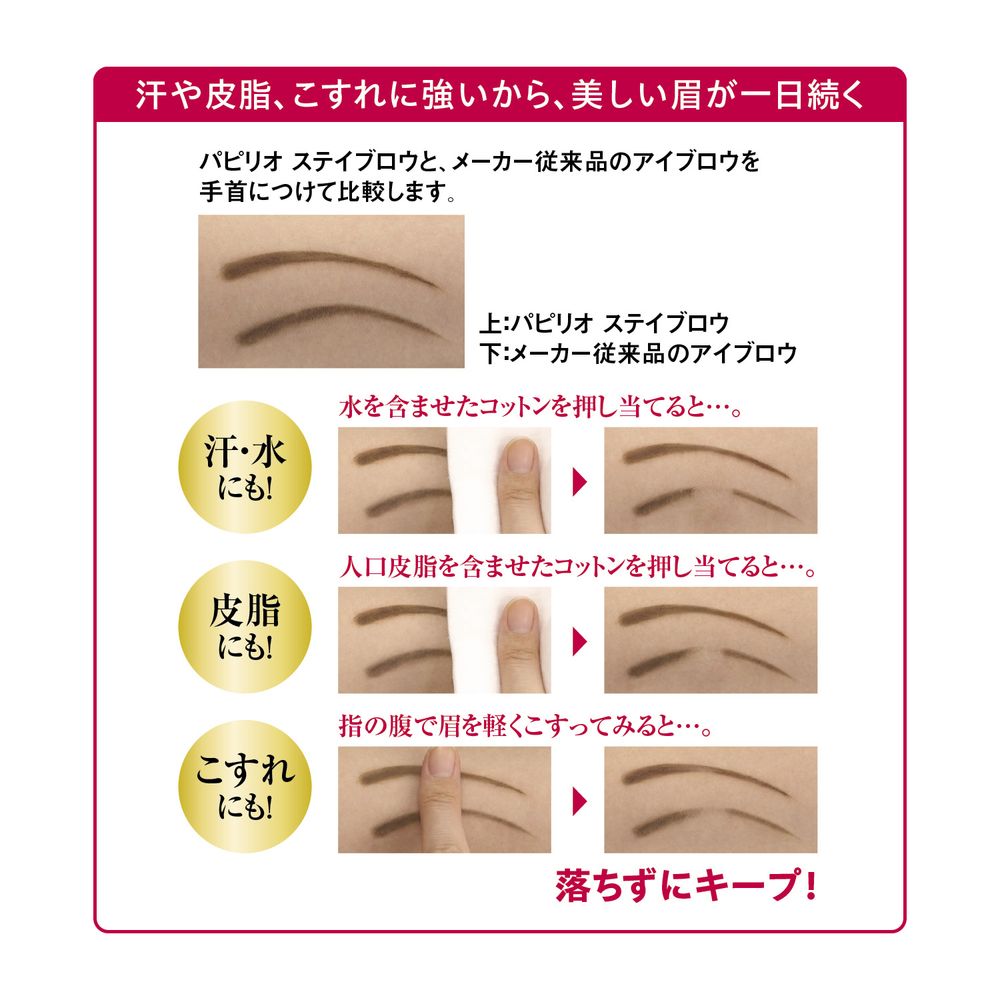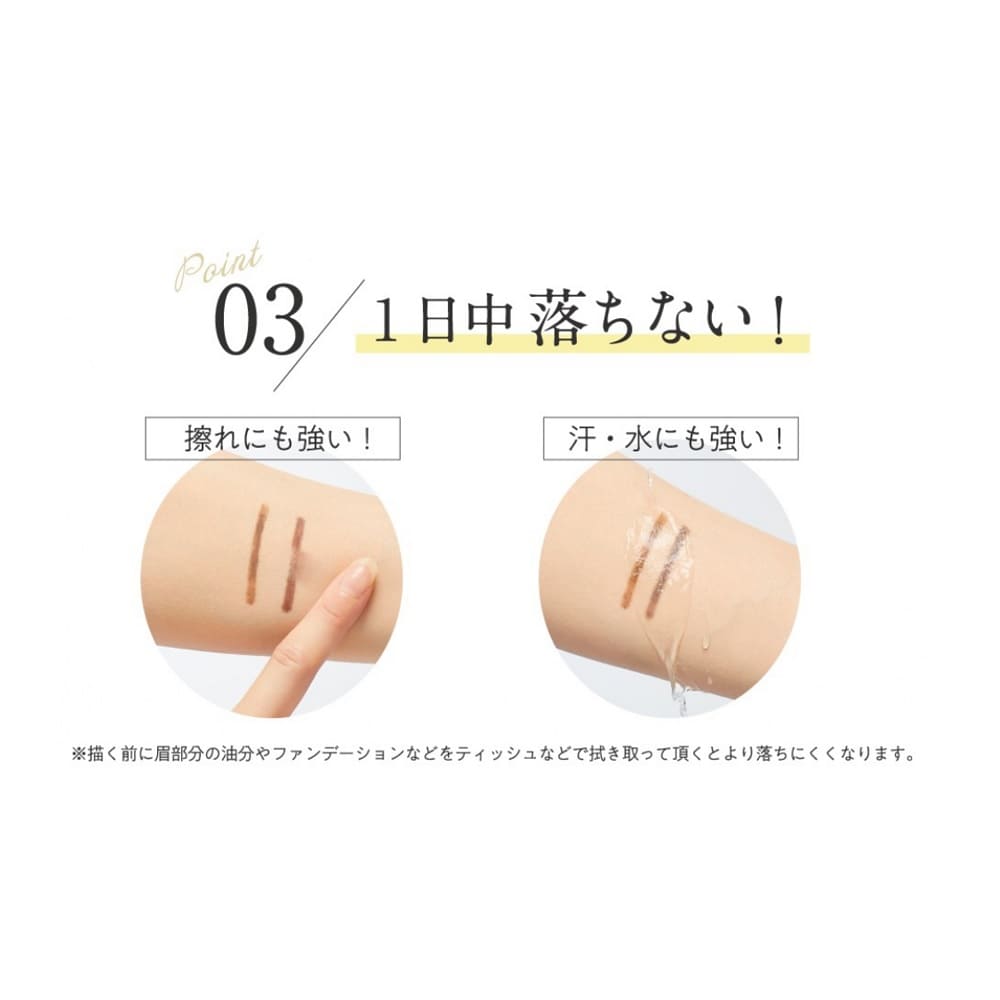 汗・水・皮脂・擦れに強く、落ちにくいカラーフィックス成分(*1)がカラー成分をコーティングし、変色や色落ちを防いで美しい眉をキープ。