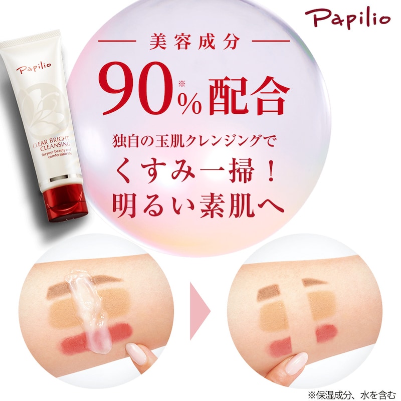 パピリオの独自成分、MCキトサン(*3)を配合。独自のアクアゲル構造により、肌になじませるとクレンジング成分が素早く肌に広がり、メイク/毛穴・皮脂・外気からの汚れ/古くなった角質・角栓(黒ずみ)/肌の上に残ったスキンケア剤を包みこみ、なじませた後洗い流すと、スルンと落とせます。洗い流した後の肌には、保湿効果を有するMCキトサンが保湿ヴェールを形成し、肌の潤いを守ります。