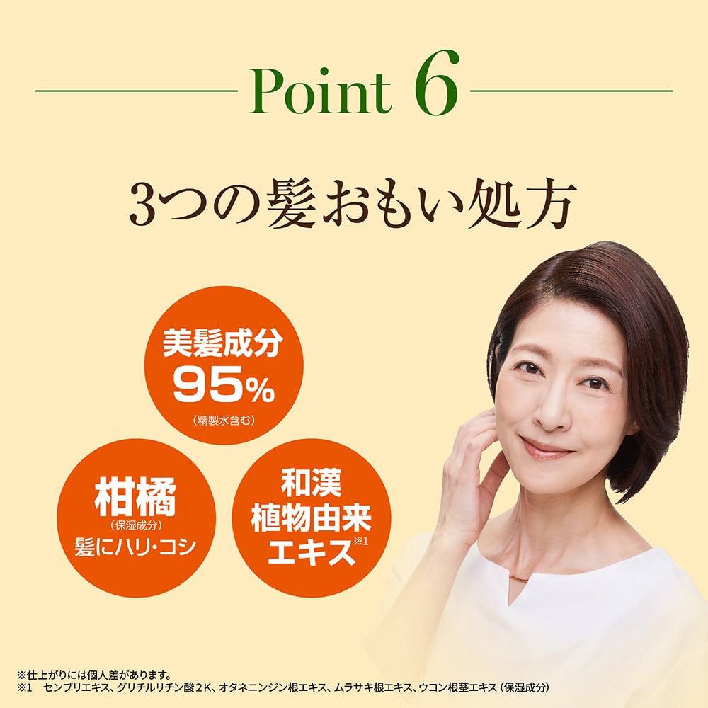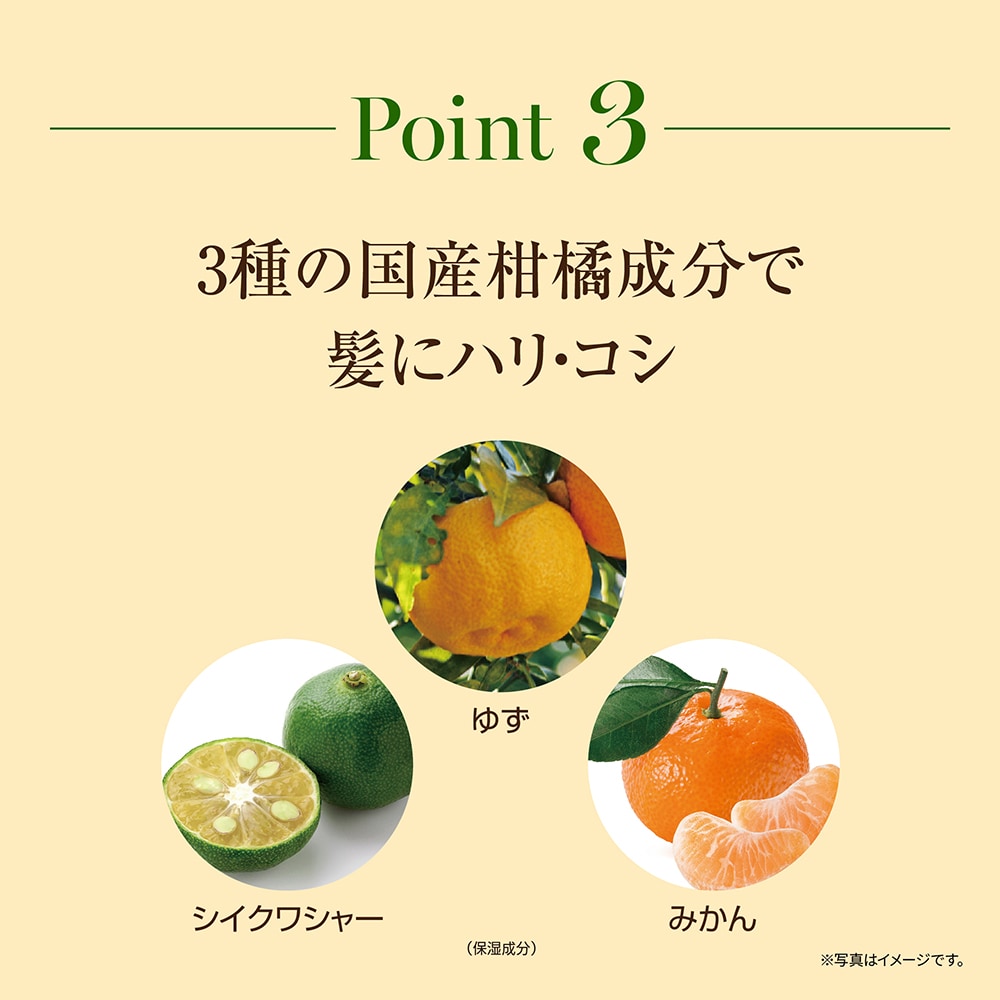 また、髪と頭皮のための3種の国産柑橘成分(ハリコシ成分)を配合しています。