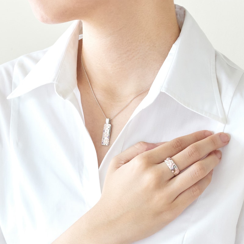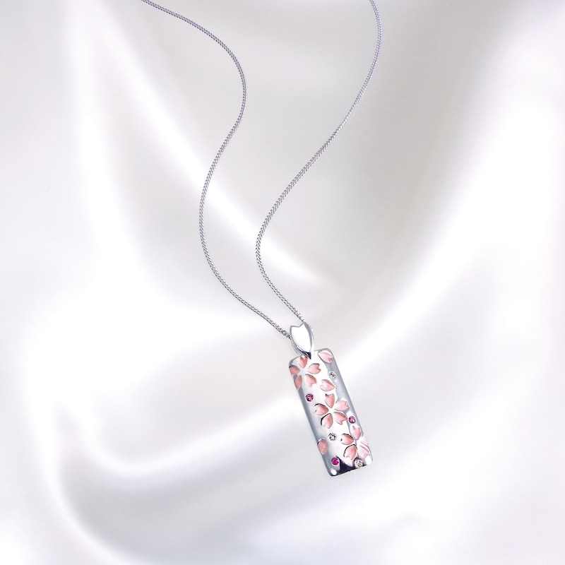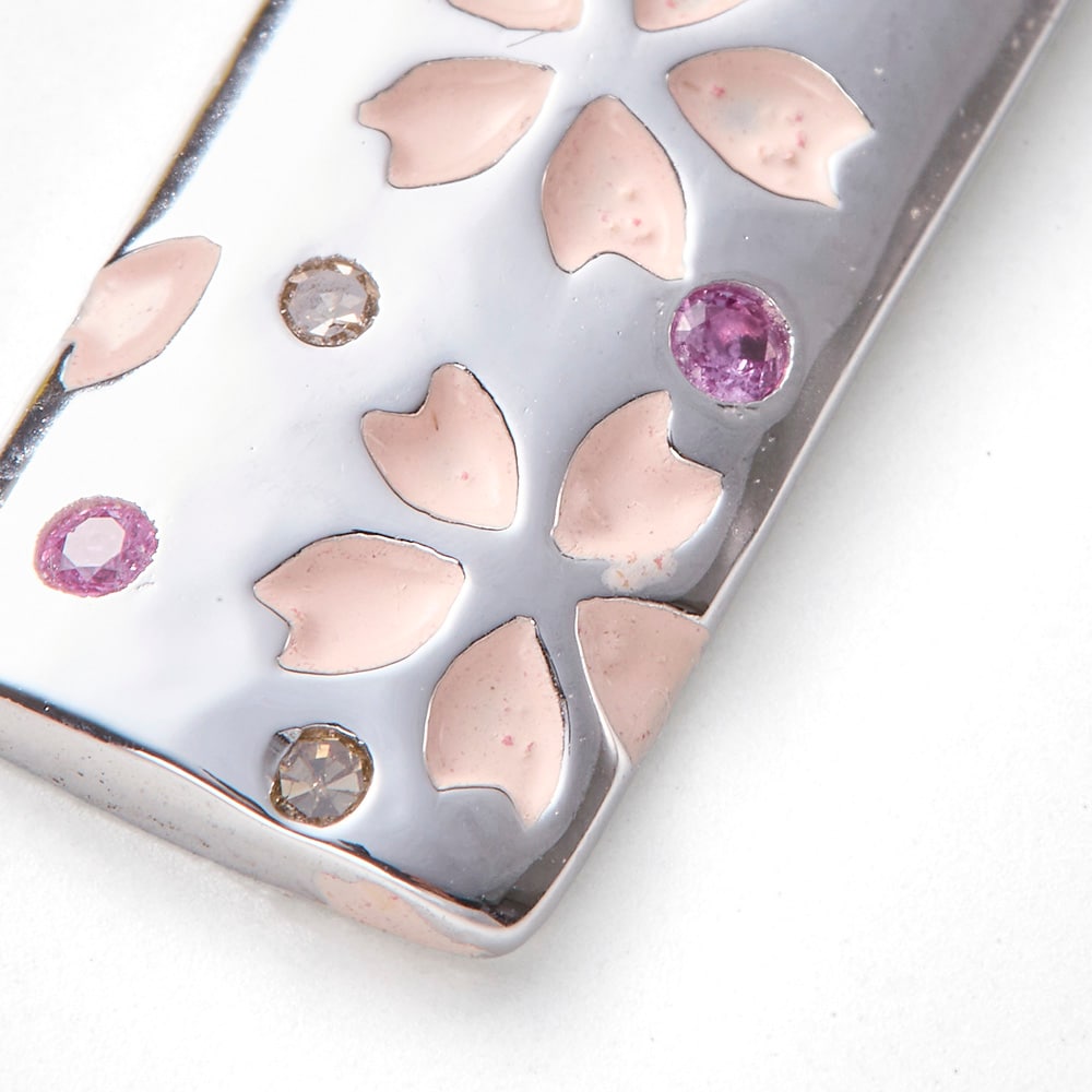 ネックレス本体:シルバー、桜彫り:ピンクカシュー仕上げ、ピンクサファイヤ、ダイヤモンド、チェーン:真鍮(ロジウムメッキ加工)
