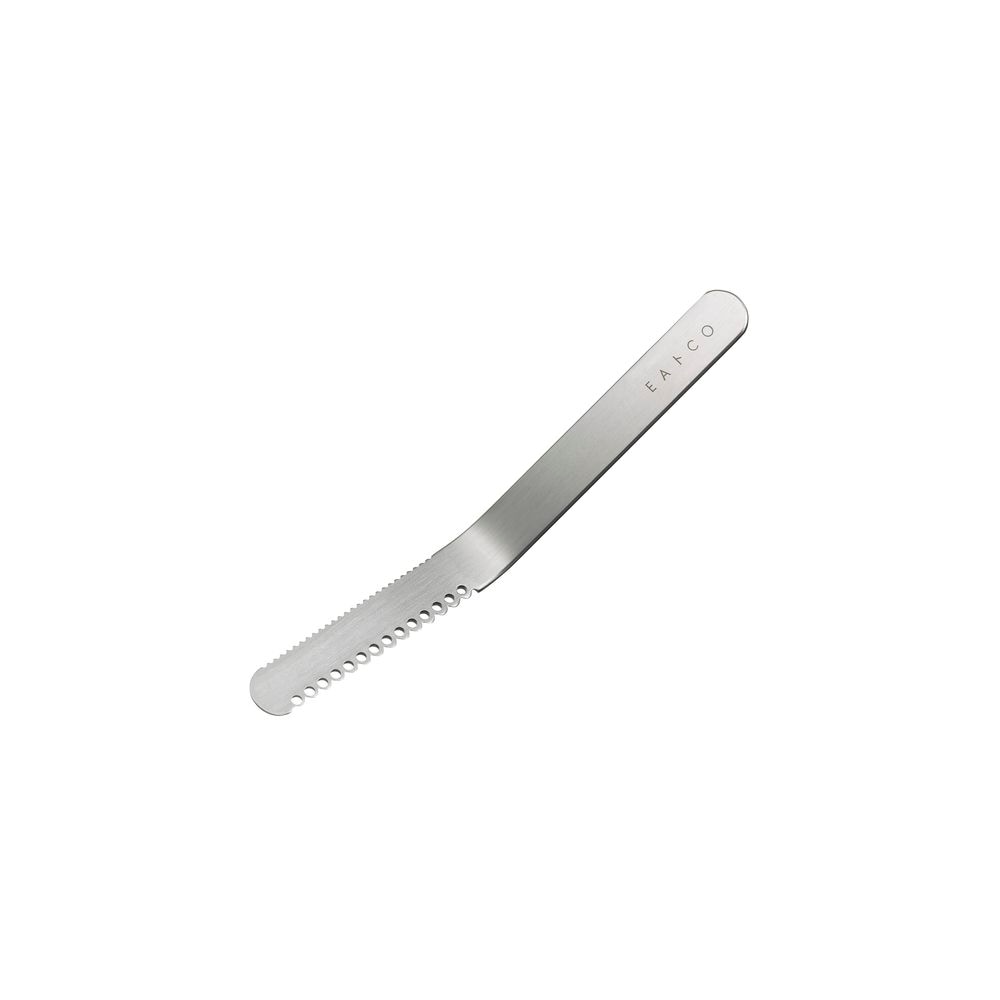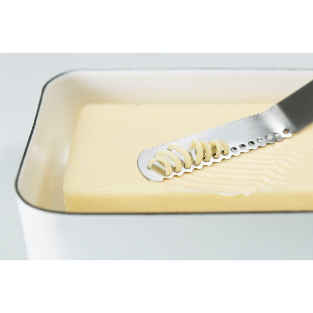 Nulu/斜めの穴状の刃で固いバターを糸状にけずり、ふんわり塗れるバターナイフです。ケースに入ったバターにも使いやすい形状です。ギザ刃部分は焦げ落としとして使用できます。置いた時には刃部が上になるよう設計されているので衛生的です。