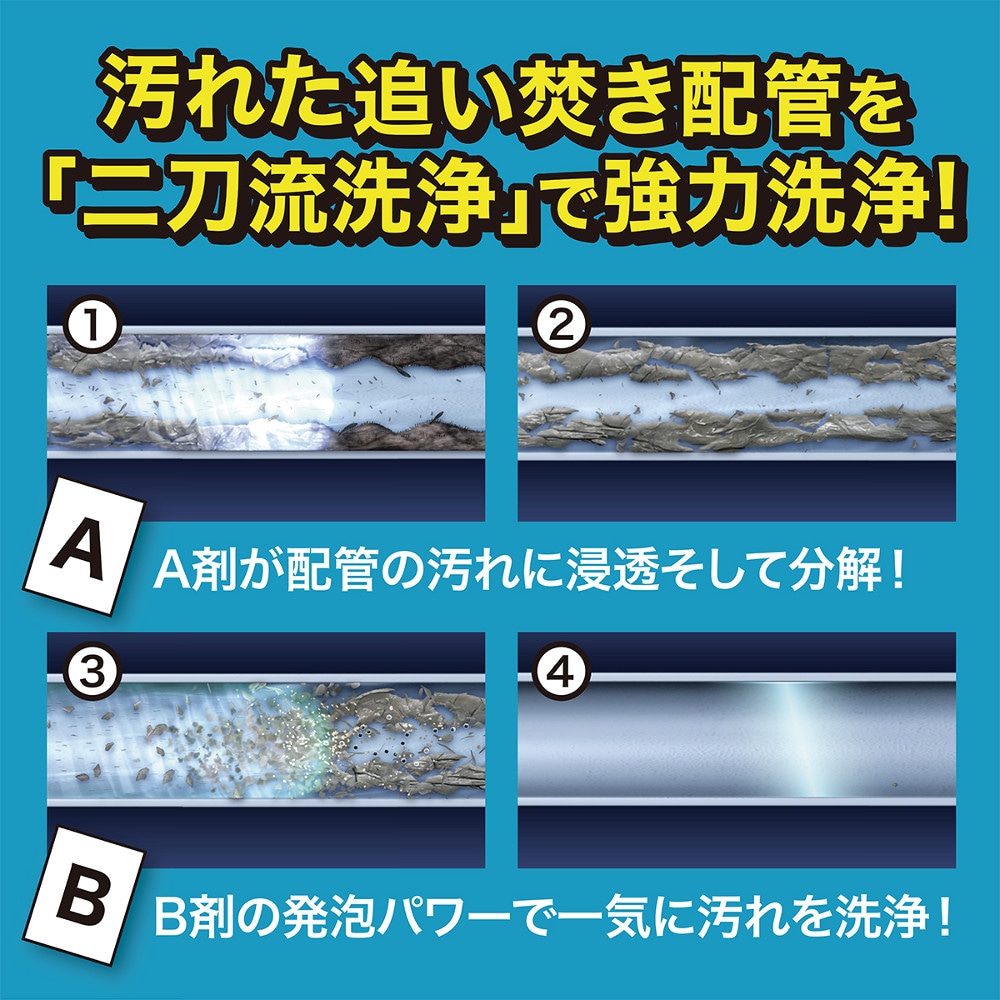 ●A剤が汚れに「浸透・分解」、B剤の発泡パワーが汚れや菌を勢いよく「押し出す」