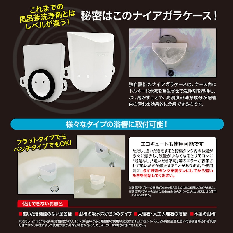 ※ただし、2つ穴でも追いだき機能があり、1つ穴が塞いである場合はご使用いただけます。※ジェットバス、24時間風呂も追いだき機能があれば洗浄可能ですが、機種によって使用方法が異なる場合があるため、メーカーにお問い合わせください。