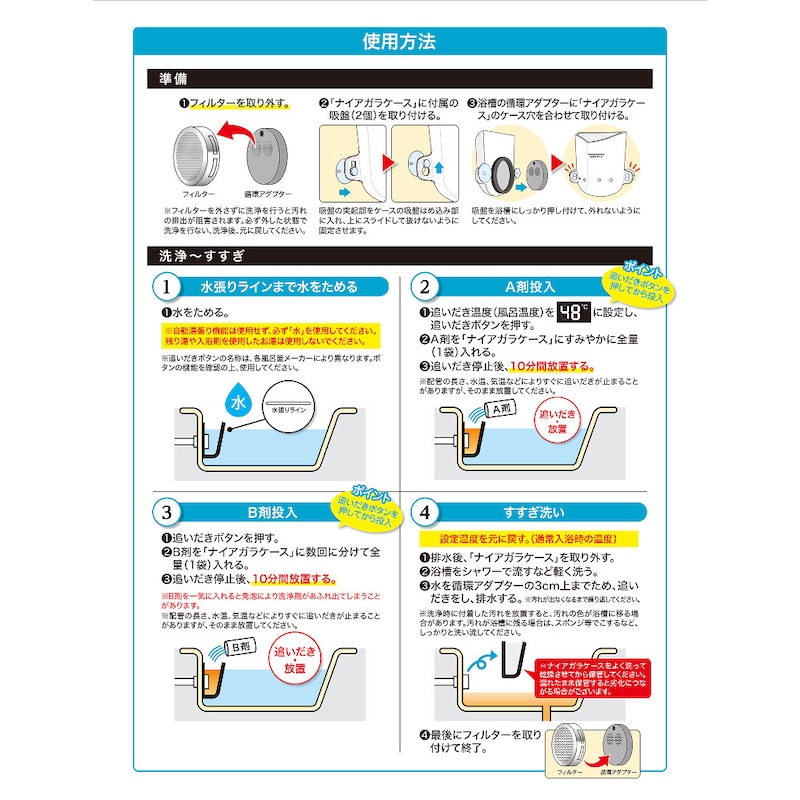 ●使用料の目安:家庭用サイズの浴槽に1回につき、A剤・B剤各1包(全量)