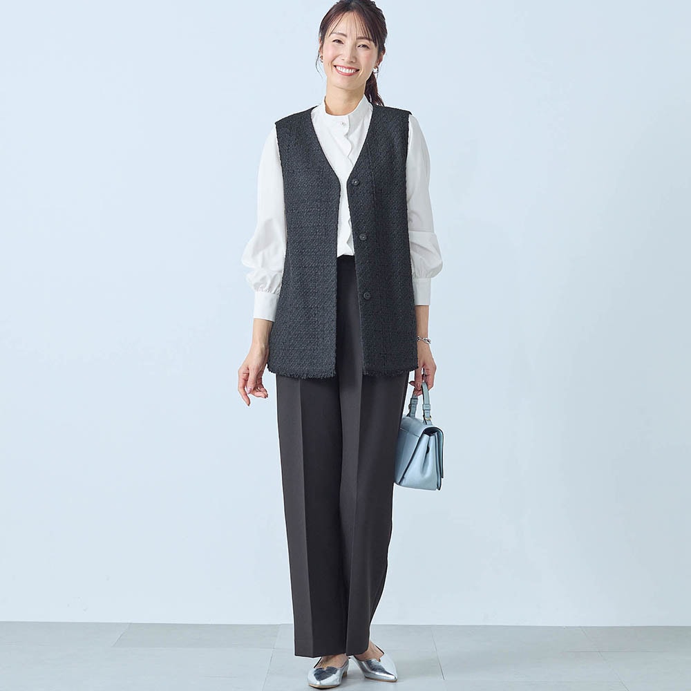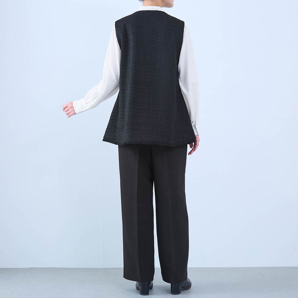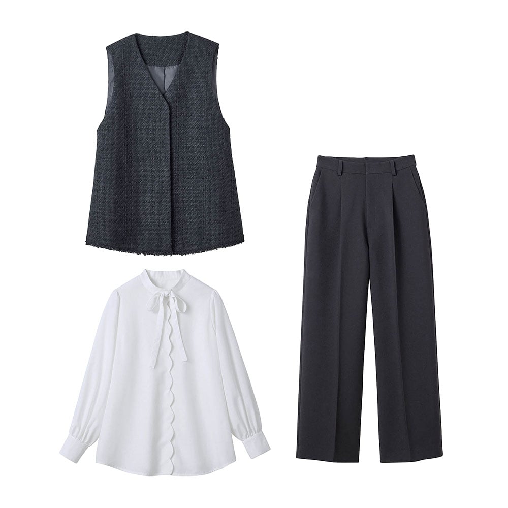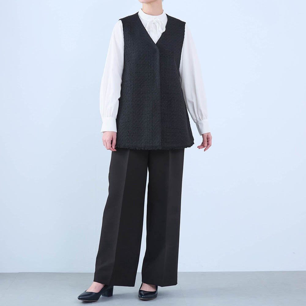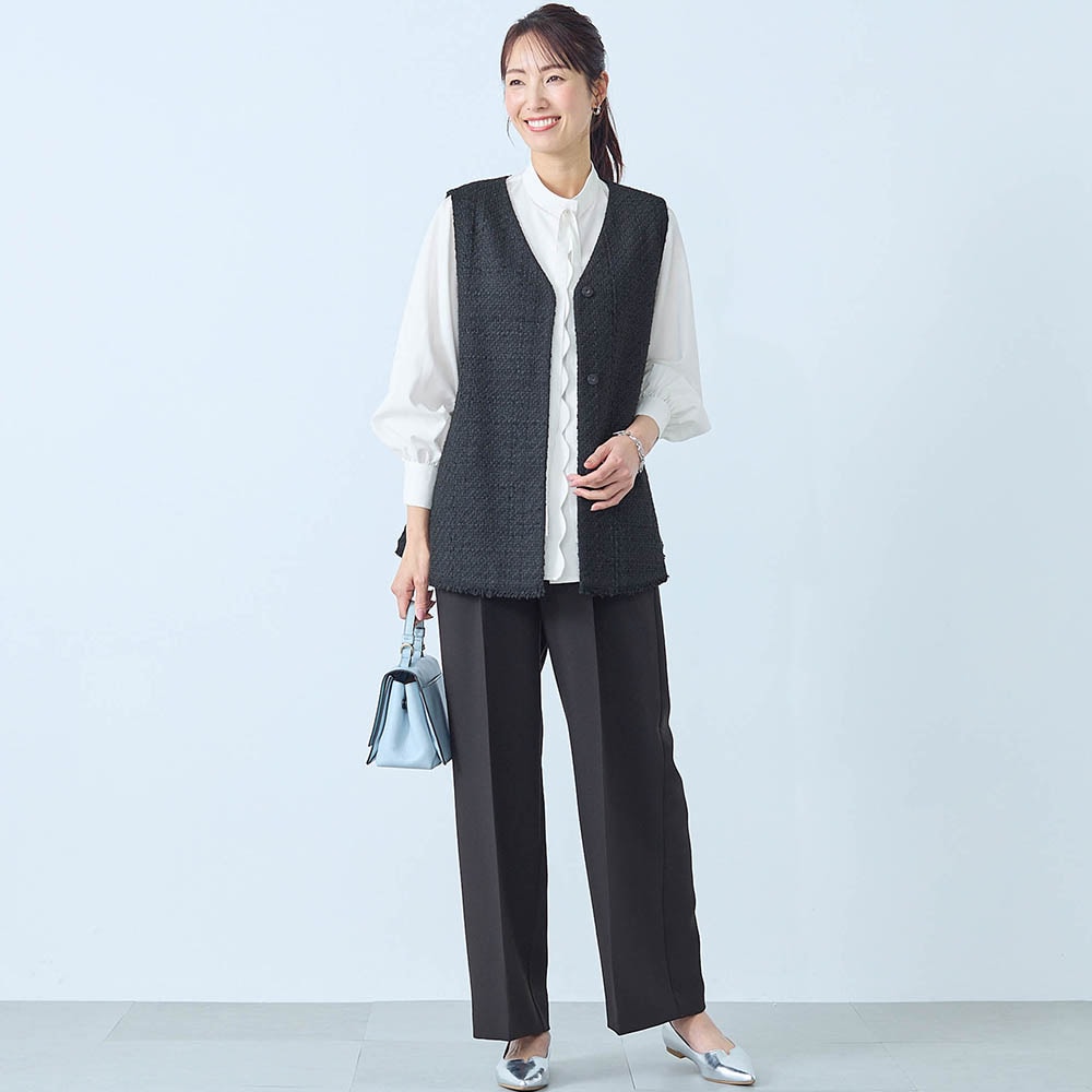 ツイードジレ/ワイドパンツ/スカラップブラウス