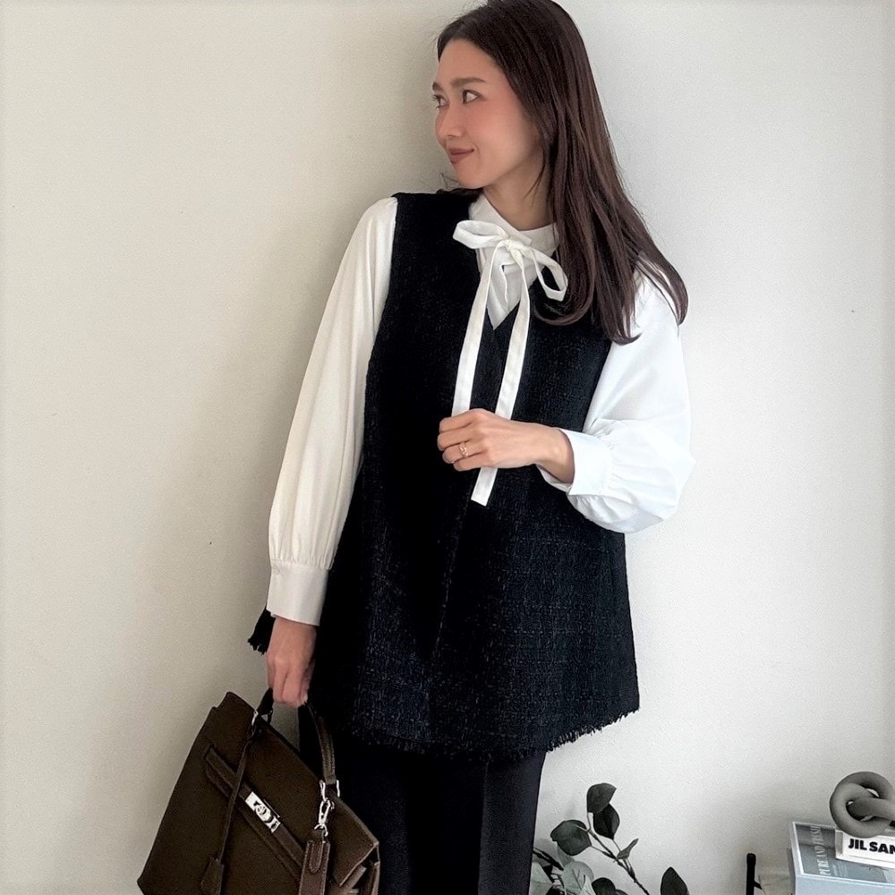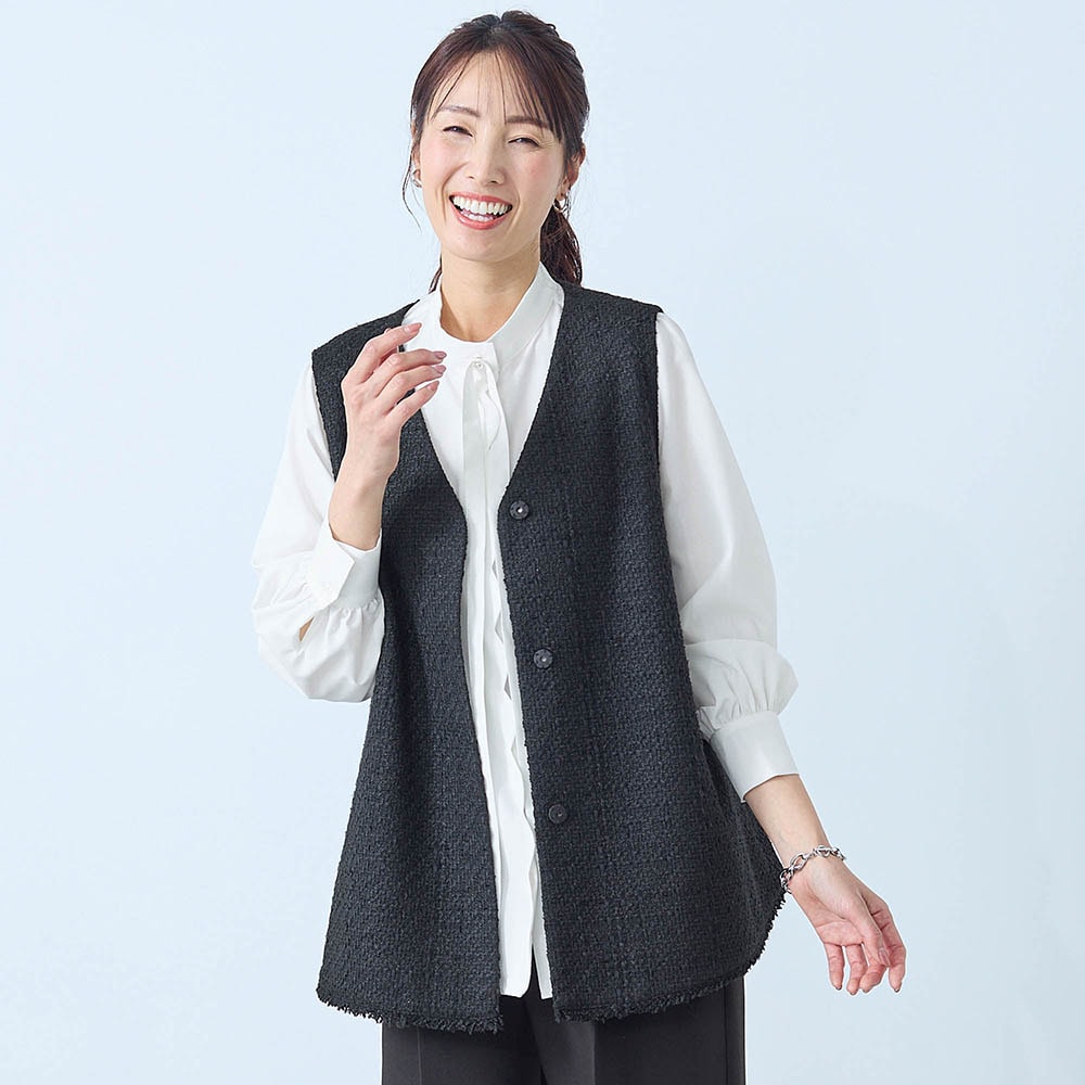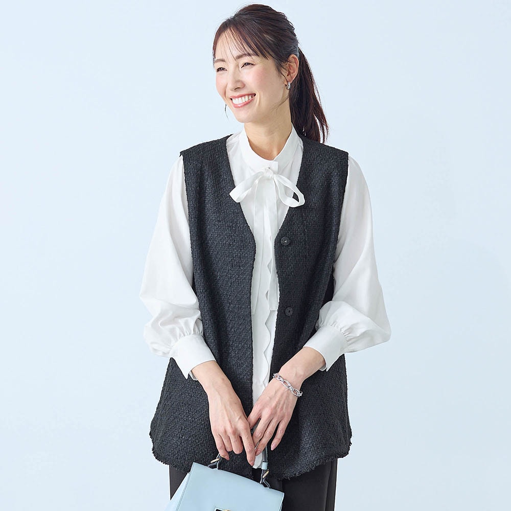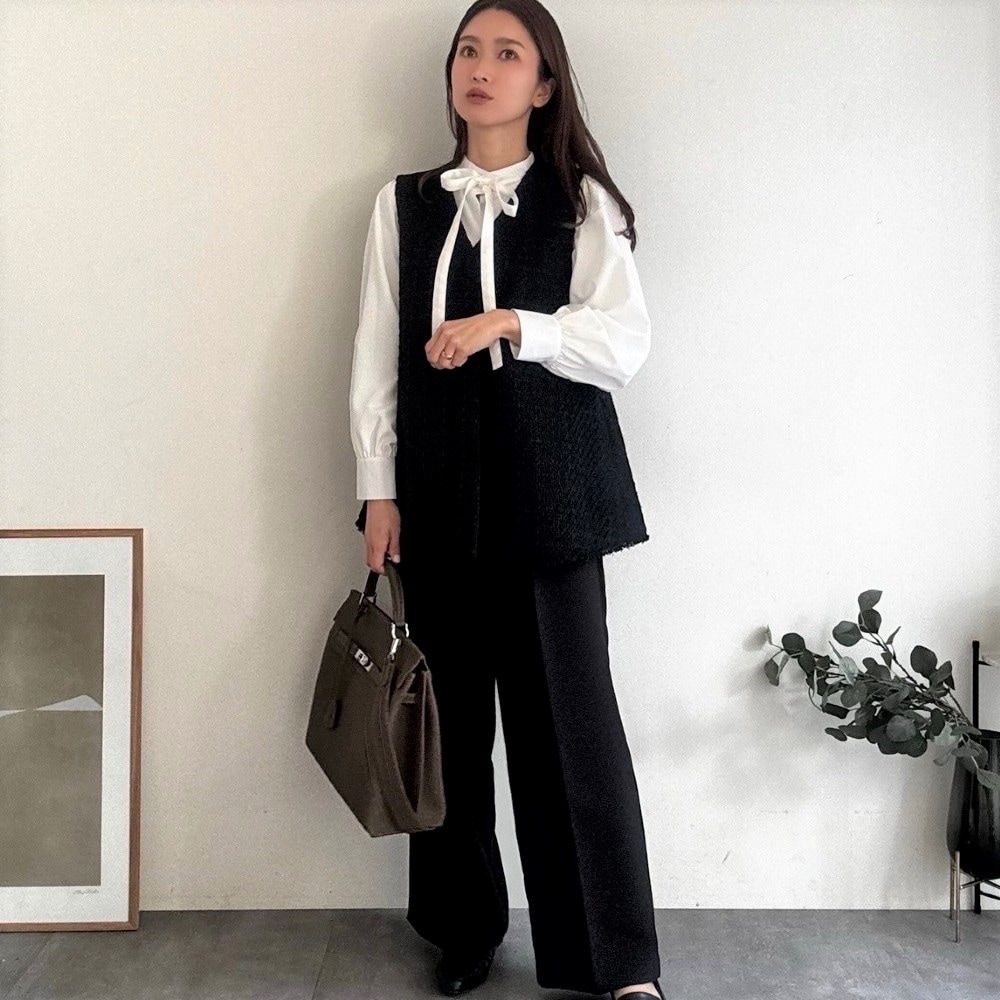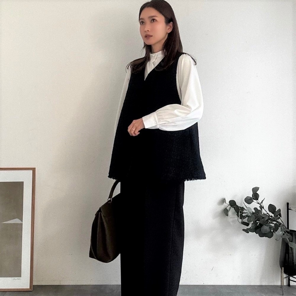 ツイードジレ/ワイドパンツ/スカラップブラウス