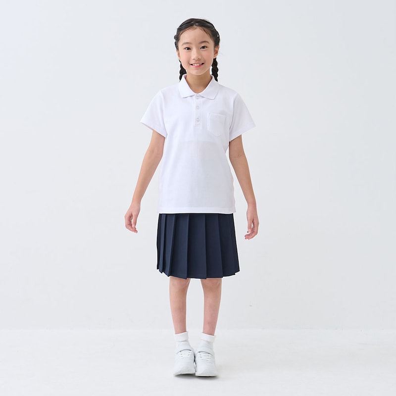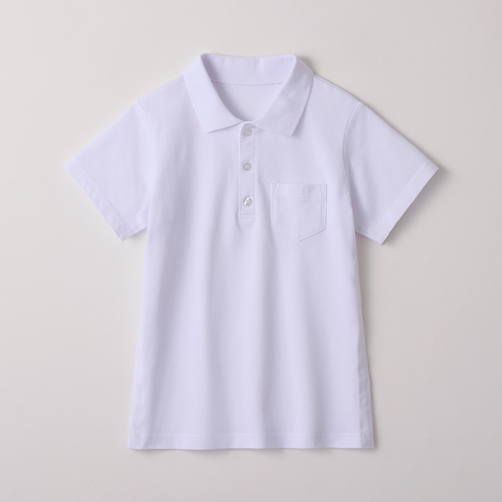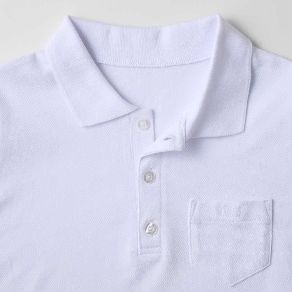 ●前:中央ボタン留め、左胸ポケット、ポケットに名札付け用ホール