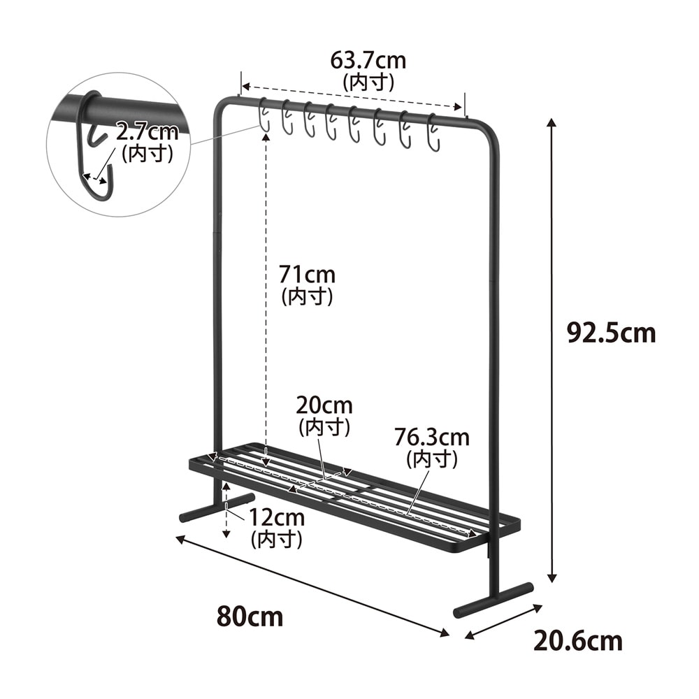 ●内寸/棚:幅約76.3、奥行約20cm、フック下から棚上:高さ約71cm、棚下:高さ約12cm、フック開口幅:約2.7cm