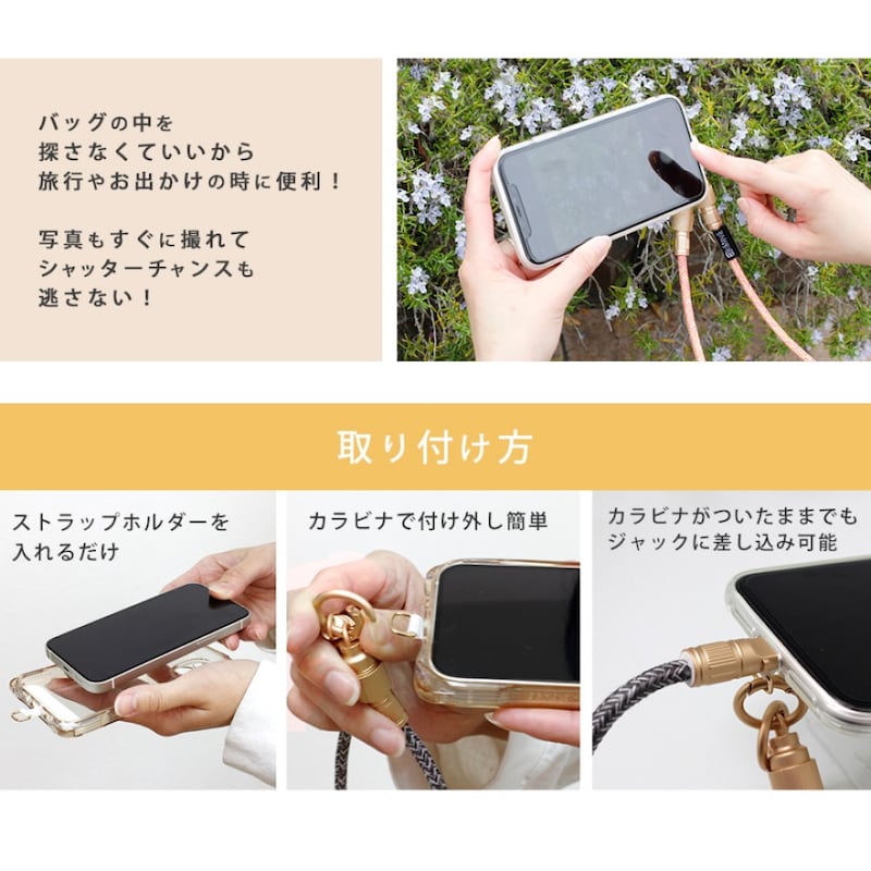 ●付属のストラップシートを使ってスマホを付けられる丸いカラビナ1個付き