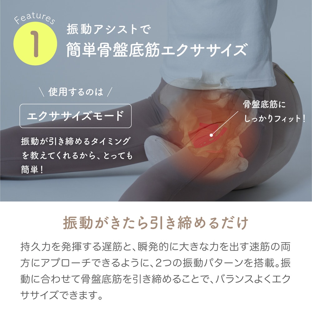(1)骨盤底筋引き締め運動 2種類の振動モードで骨盤底筋を効果的に引き締まます。引き締めるだけでなく、緩めることも可能です!