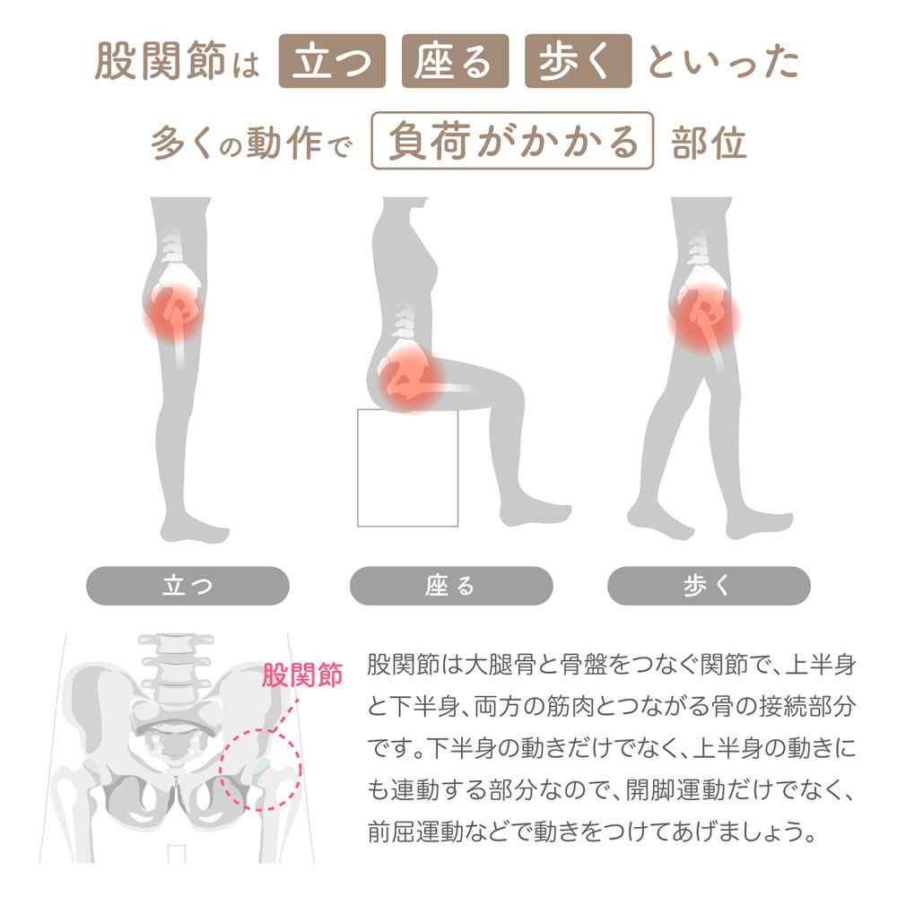 そして加齢が進むにつれて、股関節がかたくなり、腰や膝への負担も多くなります。