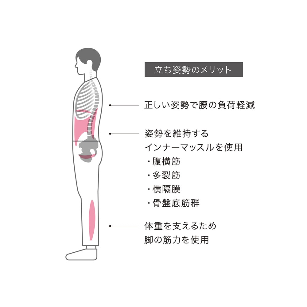 ●さらに姿勢を維持するインナーマッスルやお腹、脚の筋肉のサポートができ、健康的なスタンディングワークを目指せます。
