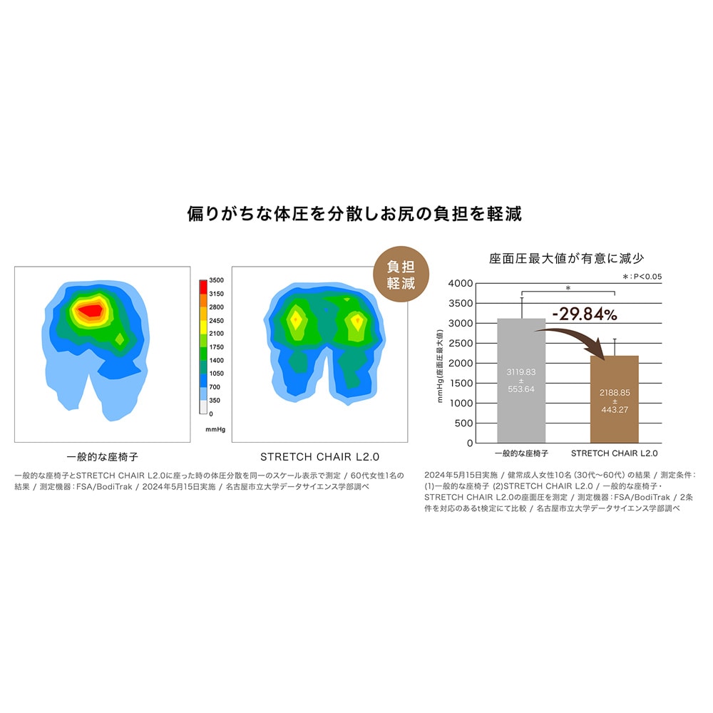 • 一般的な座椅子に比べてお尻への負担が軽減されることが確認できました