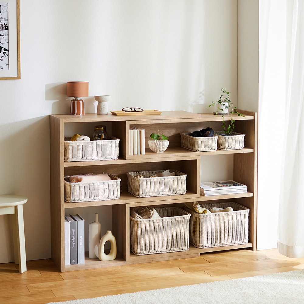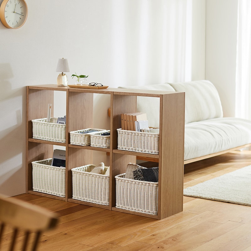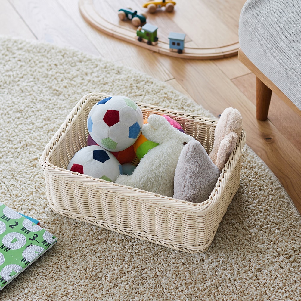 インテリアになじむ質感と、樹脂製ならではの扱いやすさを両立したバスケット。汚れやほこりが気になるときは丸洗いでき、家中の整理に役立ちます。