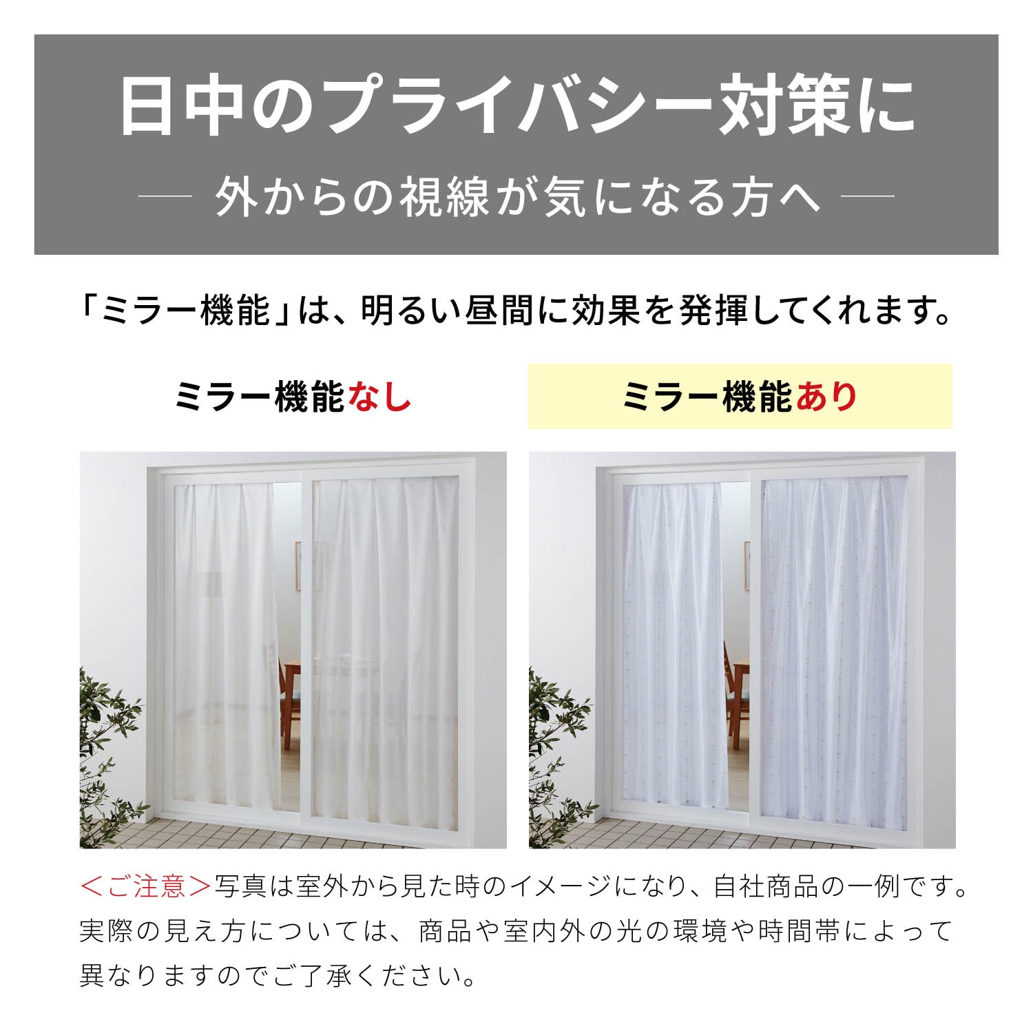 外の光がカーテンに反射することにより、部屋が見えにくくなるミラー機能