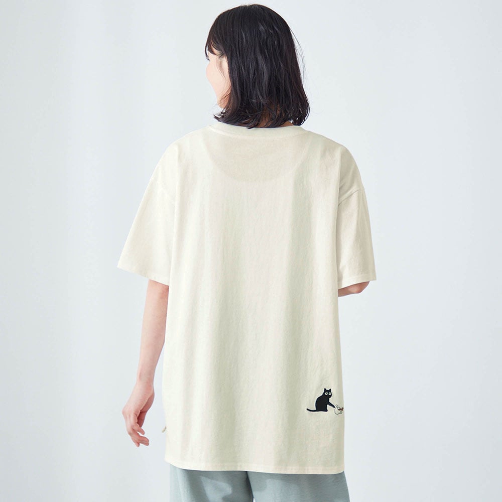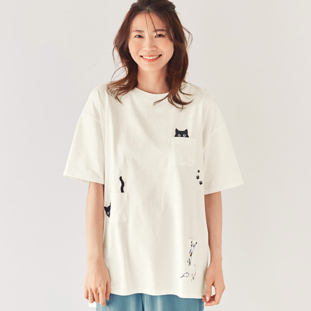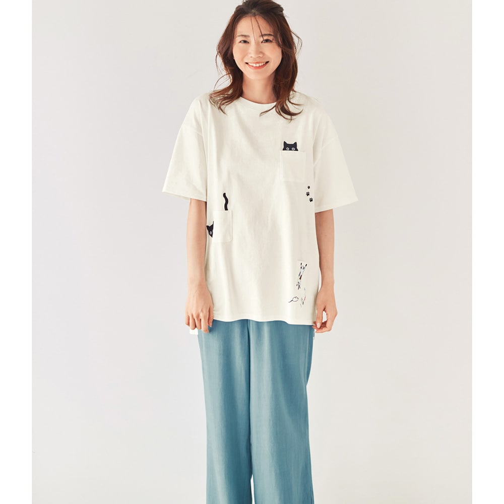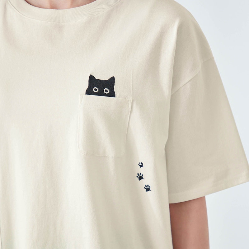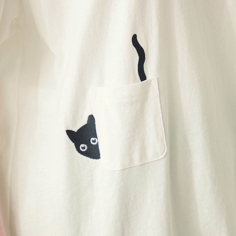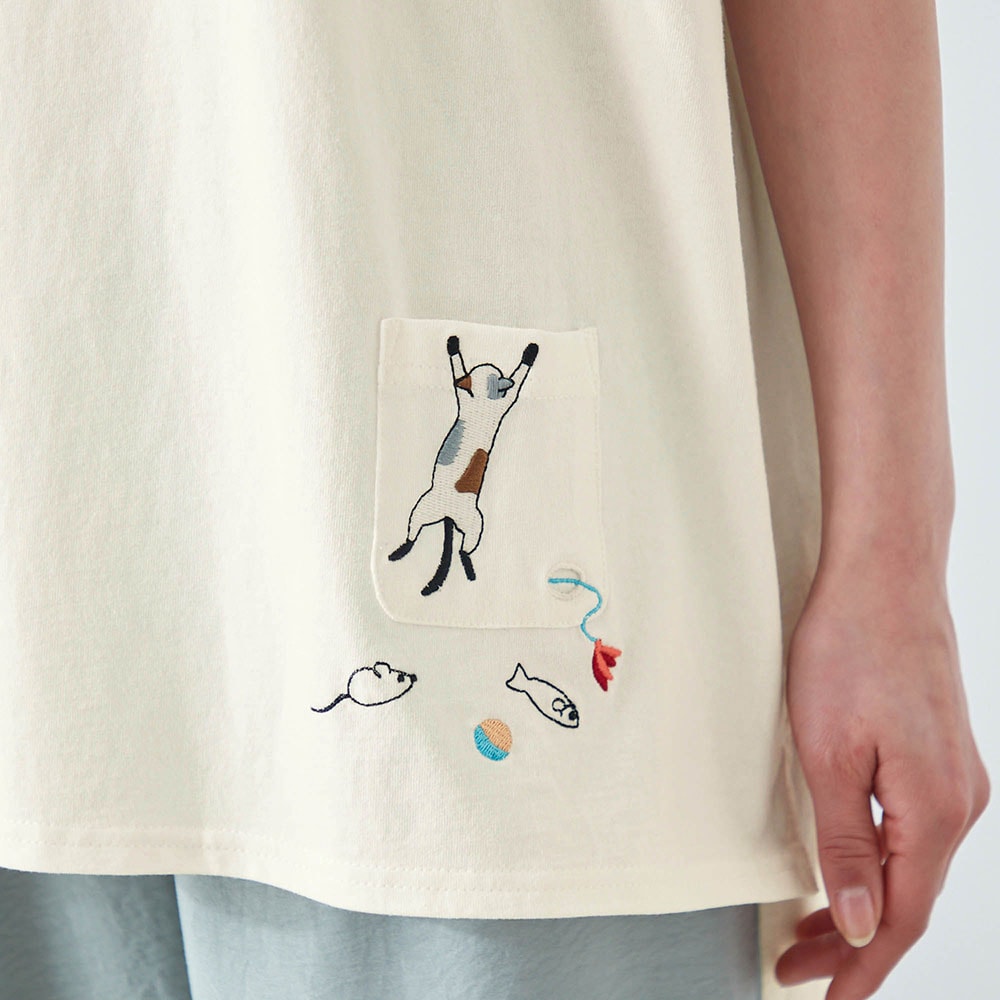 ・ポケットのそばや後ろ裾にネコの刺繍をあしらったデザイン