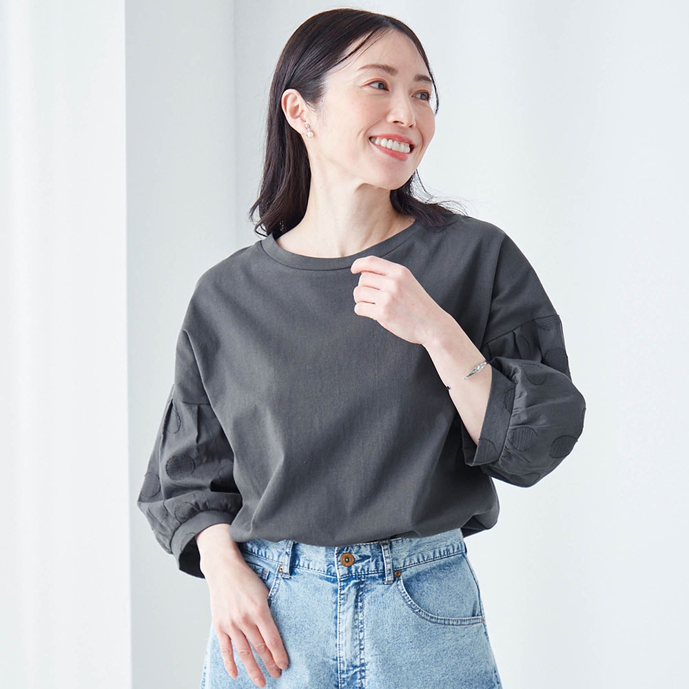 ・身頃は心地よいカットソー、袖は上品なドットジャカード
