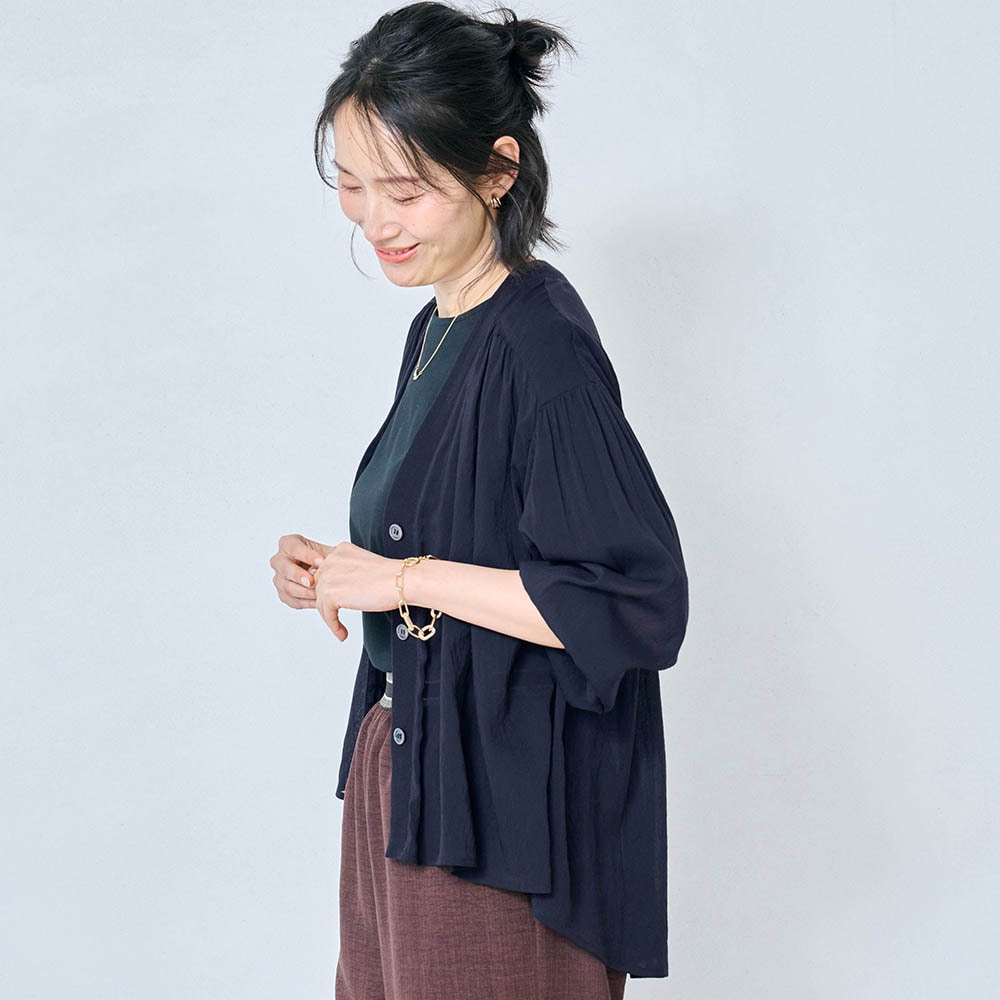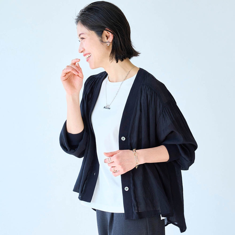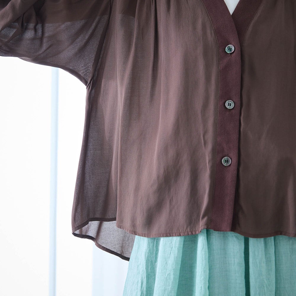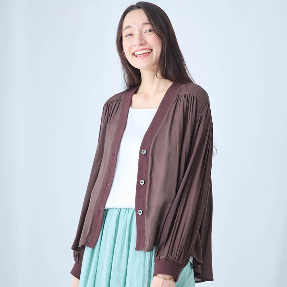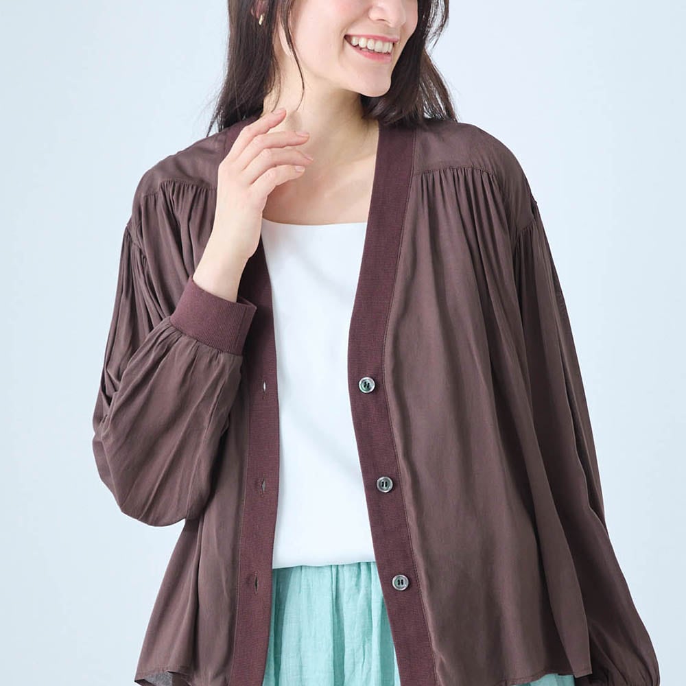 ・シアーな布帛素材とカットソーリブをドッキングしたカーディガン