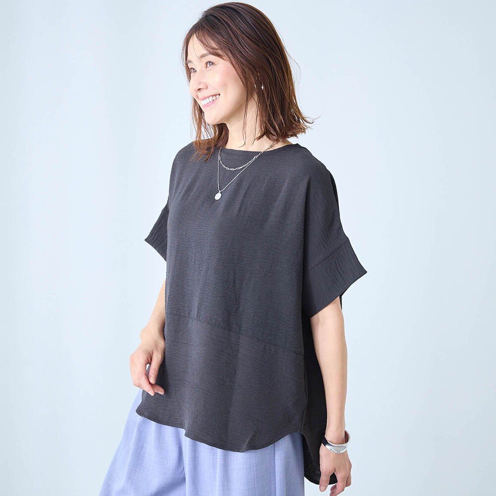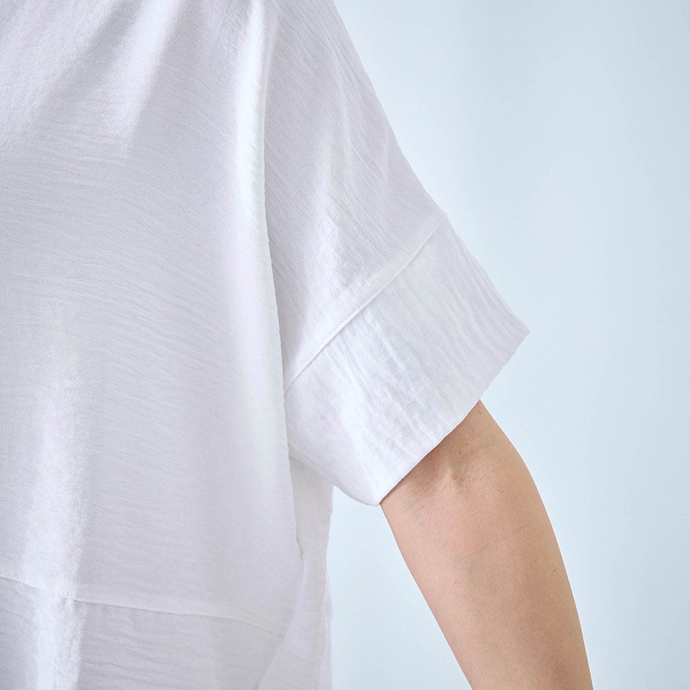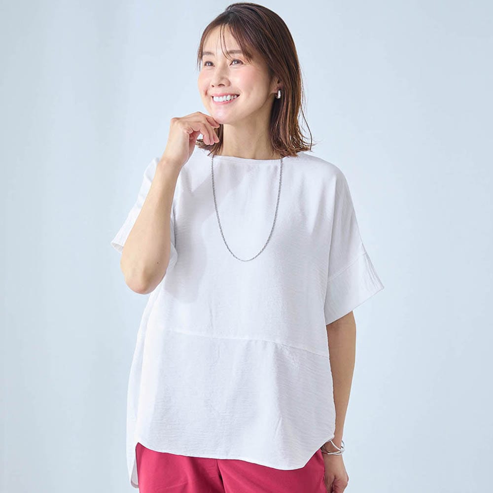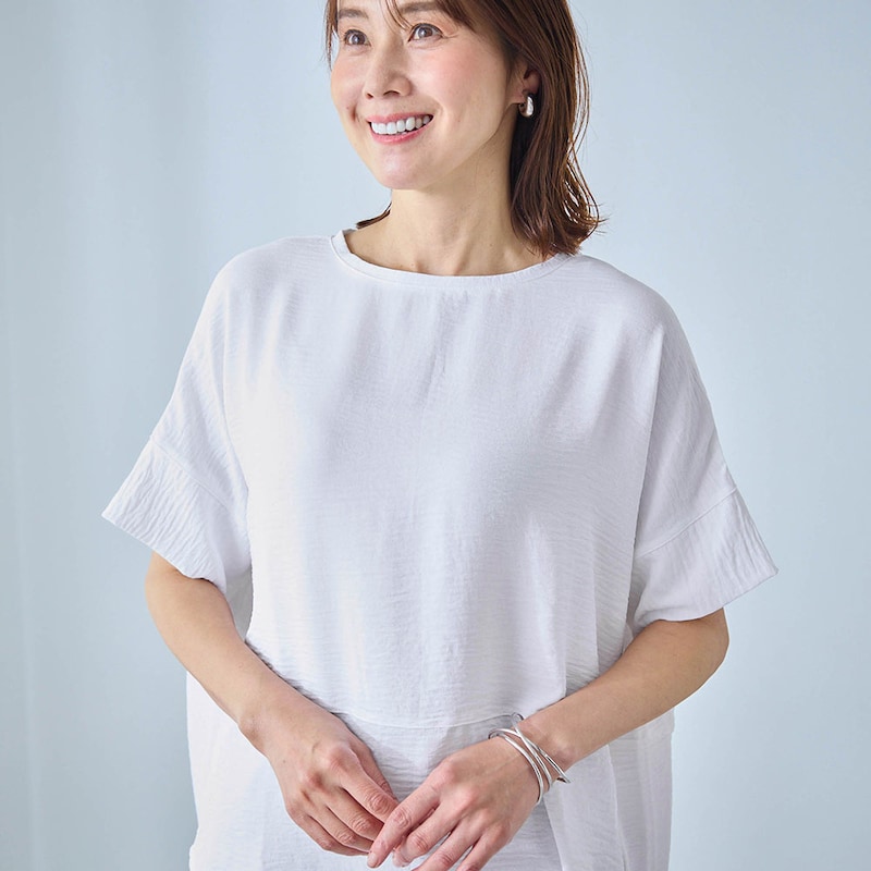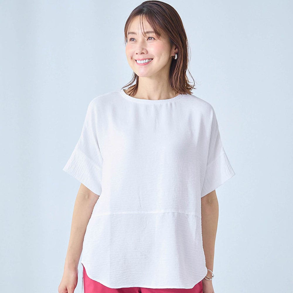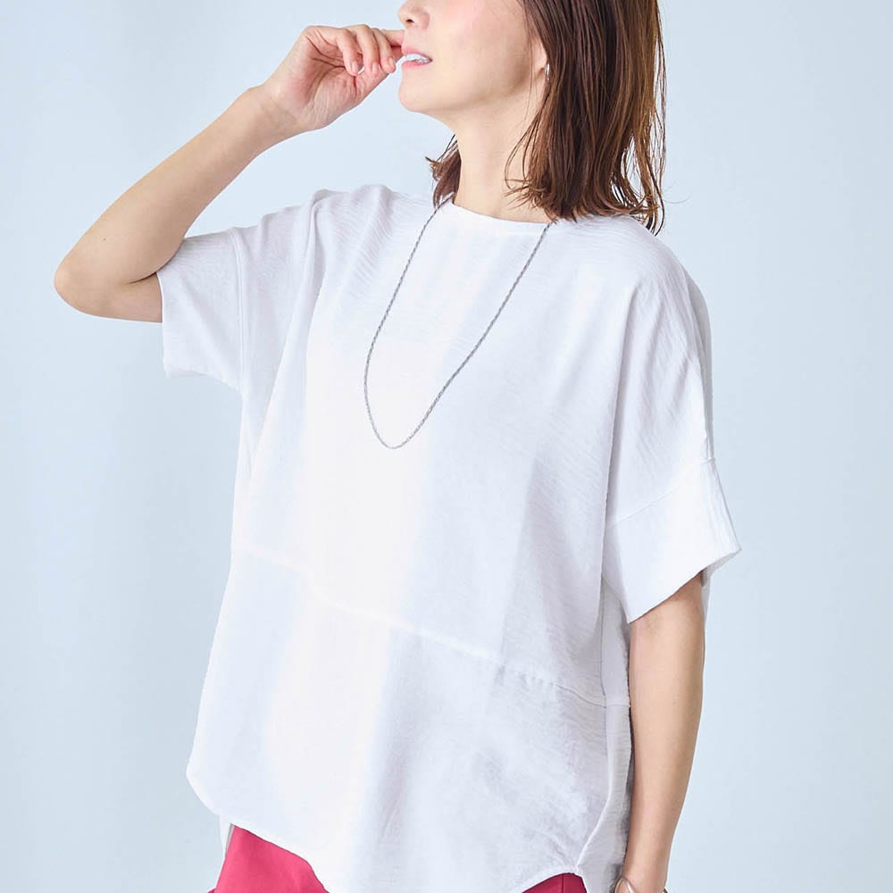 • 二の腕を隠す長めの袖丈は、切替え入り