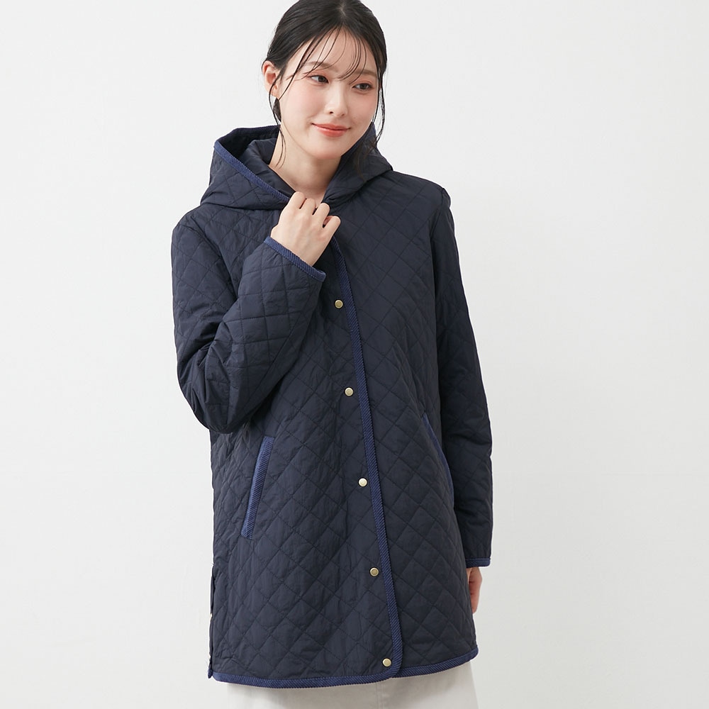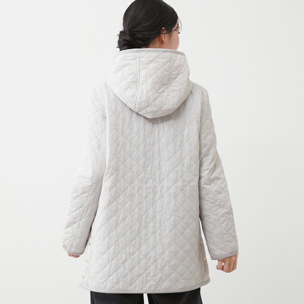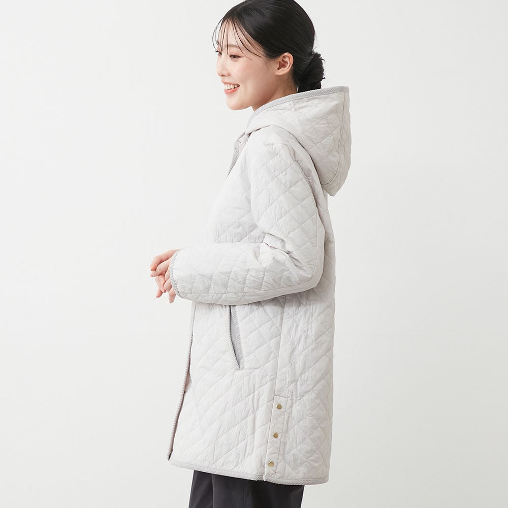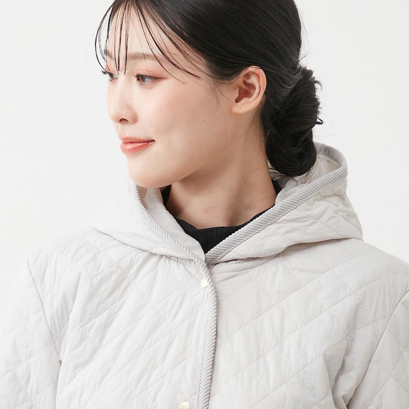 軽い着心地なのに暖かい、フード付きキルティングコート