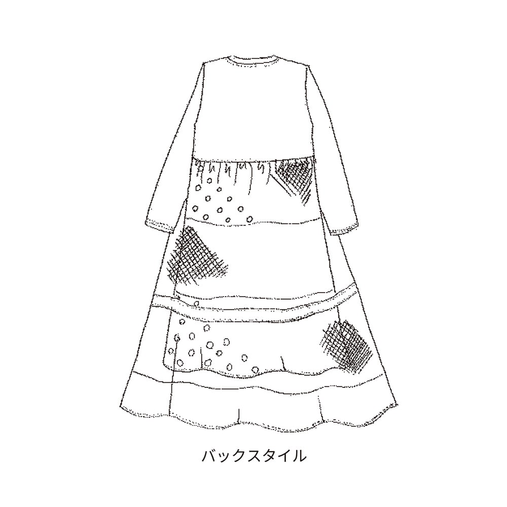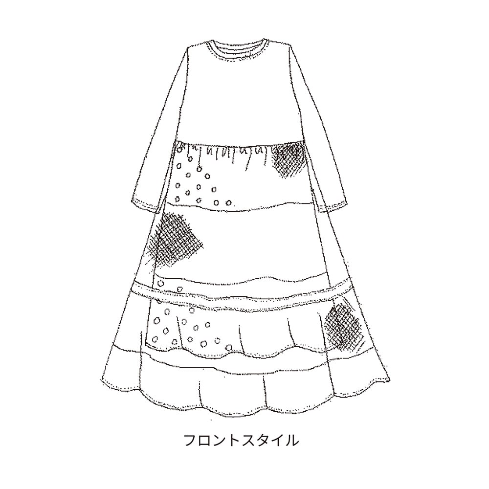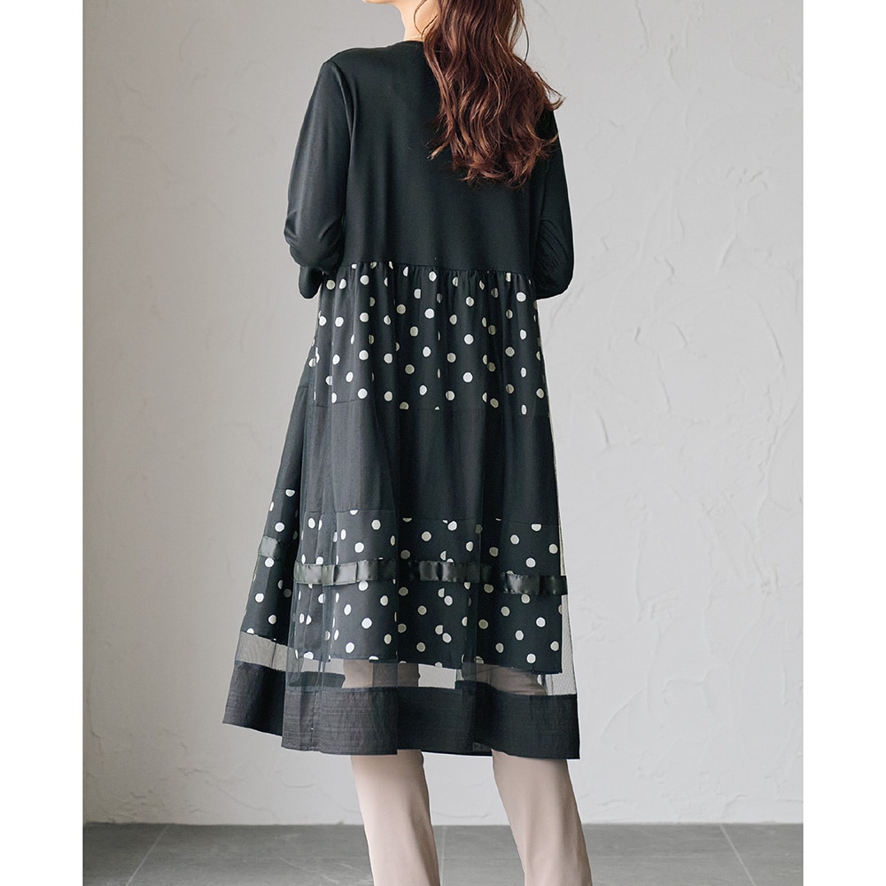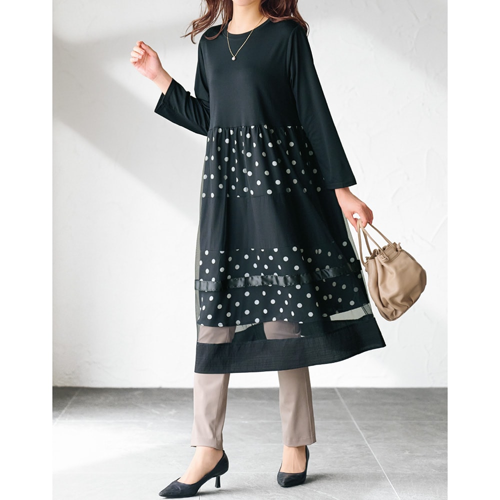 上部は動きやすいカットソー。ウエスト下からプリント生地で切替え、ふんわり軽やかなチュールを重ねた、異素材使いのドッキングデザイン。